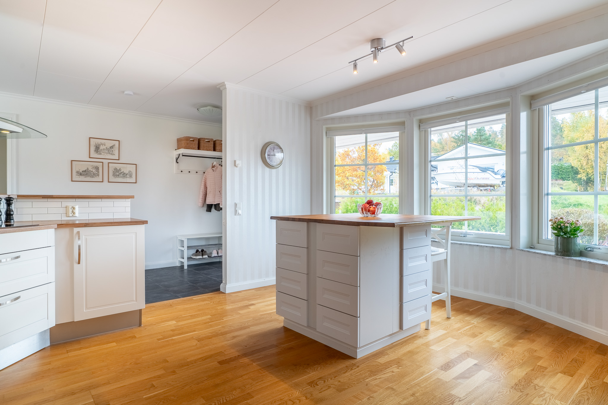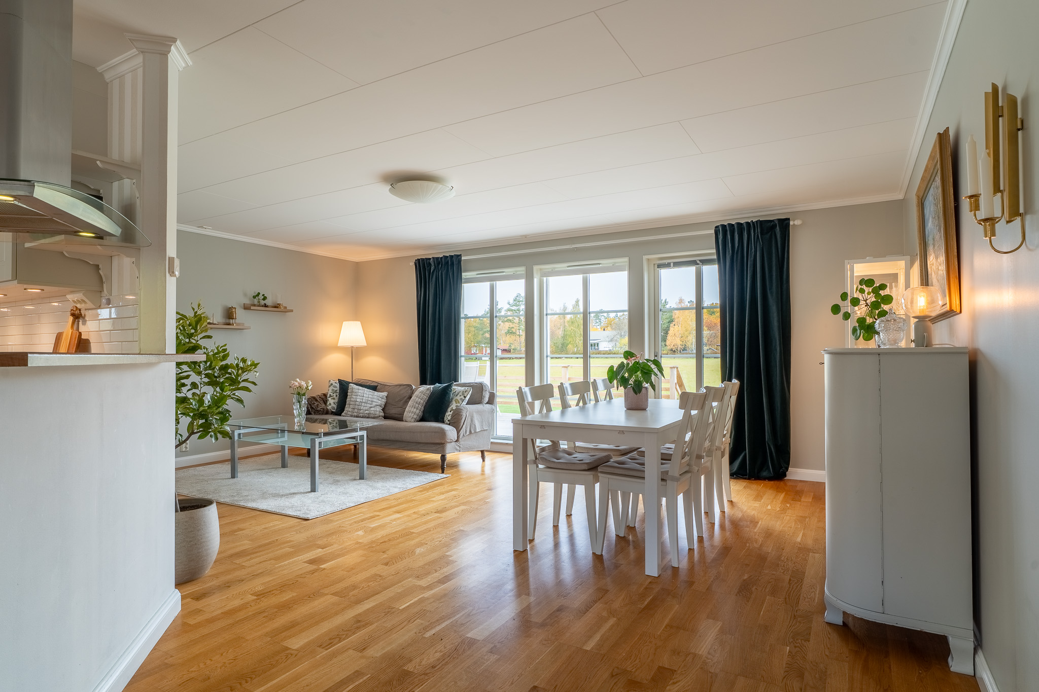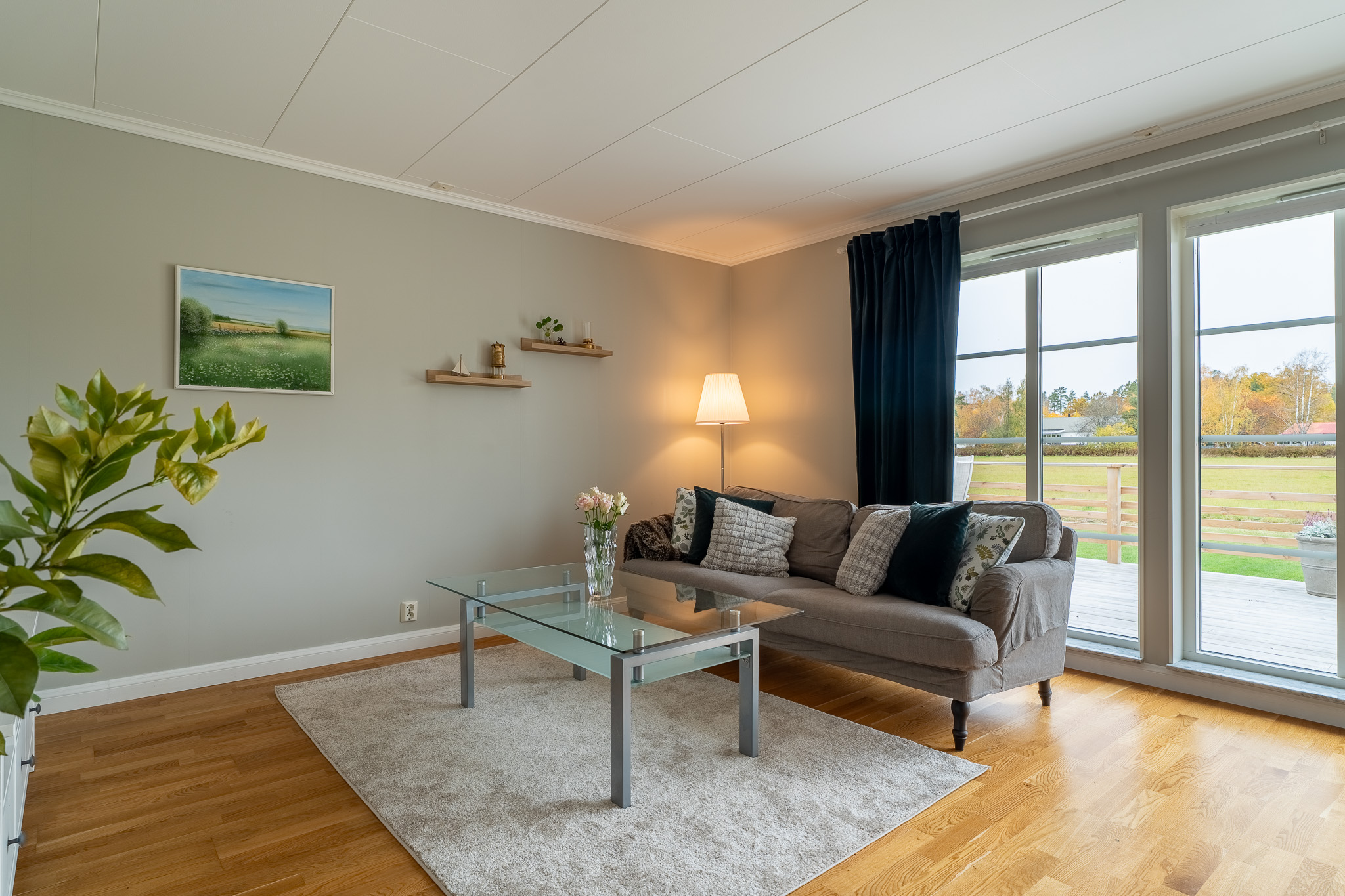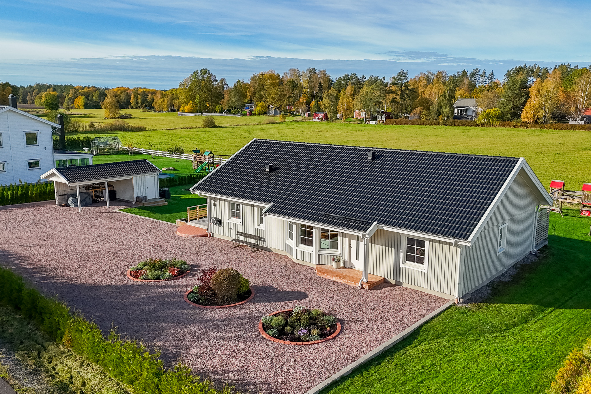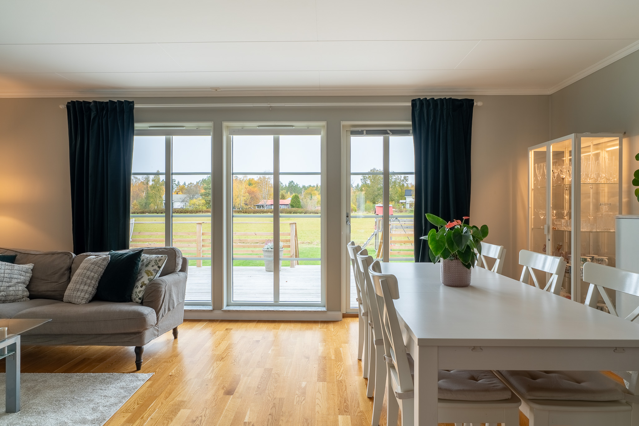 Välkommen till ett modernt enplanshus i natursköna Solvik. Här bor du bekvämt i ett välplanerat enplanshus om 130 kvm med sex rum och kök varav fyra sovrum. Bostadens ljusa sobra färger skapar tillsammans med det enhetliga golvet ett elegant och inbjudande helhetsintryck. Planlösningen är halvöppen mellan hall, kök och vardagsrum, vilket skapar utrymme för både familjeliv och umgänge. Köket och vardagsrum ligger centralt placerade mellan husets två sovrumsdelar, vilket ger en bra balans mellan umgänge och avskildhet. På den ena sidan finner ni två sovrum och ett trivsamt allrum som med fördel kan nyttjas som ungdomsrum eller varför inte för barnens lek, spel eller filmkvällar. På den andra sidan av huset ligger ytterligare två sovrum, varav det ena är lite större och kan nyttjas som ett master bedroom. Denna planlösning ger familjen möjlighet till egna privata ytor samtidigt som köket och vardagsrummet bildar en social samlingsplats för hela familjen. Bostadens kök från HTH är stilrent och funktionellt med gott om arbetsyta, generös förvaring och en inbjudande köksö som underlättar matlagningen och erbjuder extra serveringsyta. Köket är välutrustat med inbyggnadsugn, mikro, induktionshäll, fläkt, hel kyl och hel frys. Intill köket finner ni vardagsrummet som med sina stora fönsterpartier släpper in rikligt med ljus och ger er en vacker utsikt mot den natursköna omgivningen. Här finns gott om plats för både soffgrupp och matsalsmöbel, vilket gör rummet perfekt för både vardag och festligare tillställningar. Från vardagsrummet nås även den generösa altanen med fri vy över öppna fält. I huset finner ni även två badrum, båda smakfullt inredda. Det ena med dusch och det andra med bubbelbadkar. Med smart planerad planlösning finner ni även tvättstuga och groventré som ger er både nytta och funktion. Här finner ni både arbetsyta, förvaring, tvättmaskin, torktumlare och överskåp. Utvändigt möts du av en välskött tomt med nyanlagda perennrabatter på framsidan. Här finner ni även en carport med vidbyggt förråd och gott om plats för förvaring. Området är lugnt och barnvänligt, beläget på återvändsgata med närhet till natur, promenadstråk och badplats endast en kilometer bort. Här bor du lantligt men ändå nära staden. På Igelkottsvägen 18 bor du med cirka 7 minuters bilresa in till Torshälla och 15 minuter till Eskilstuna centrum. Varmt välkommen med din intresseanmälan!