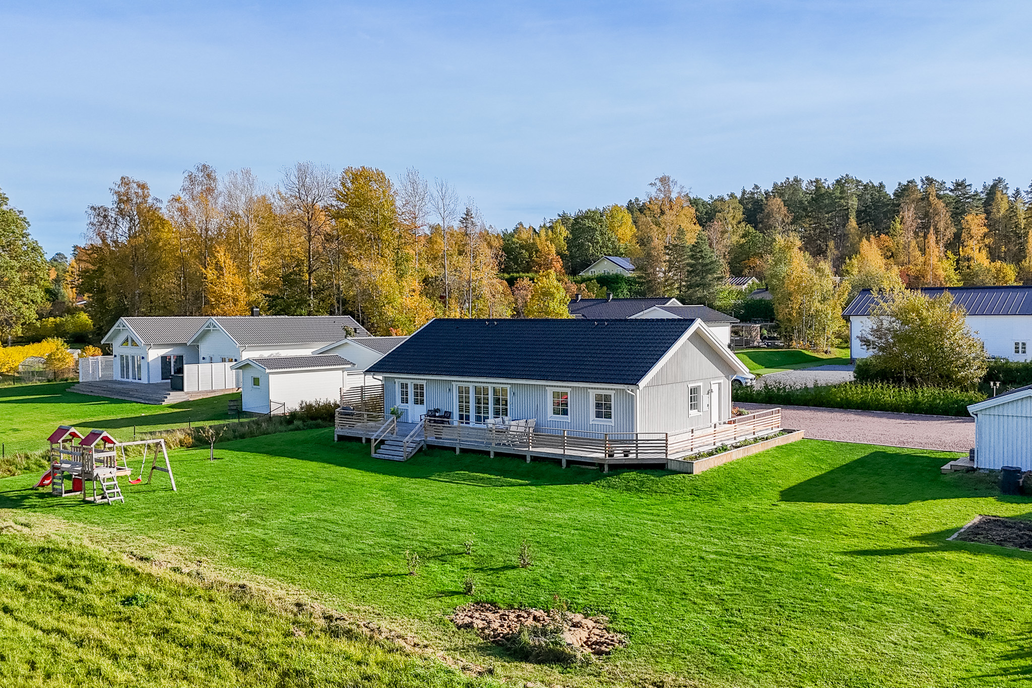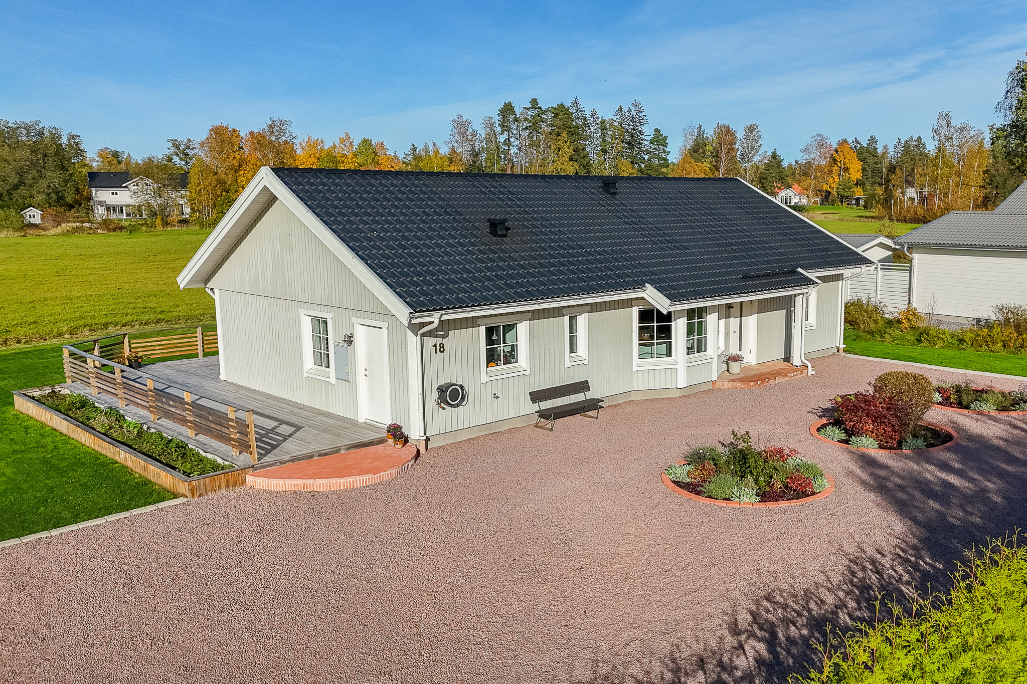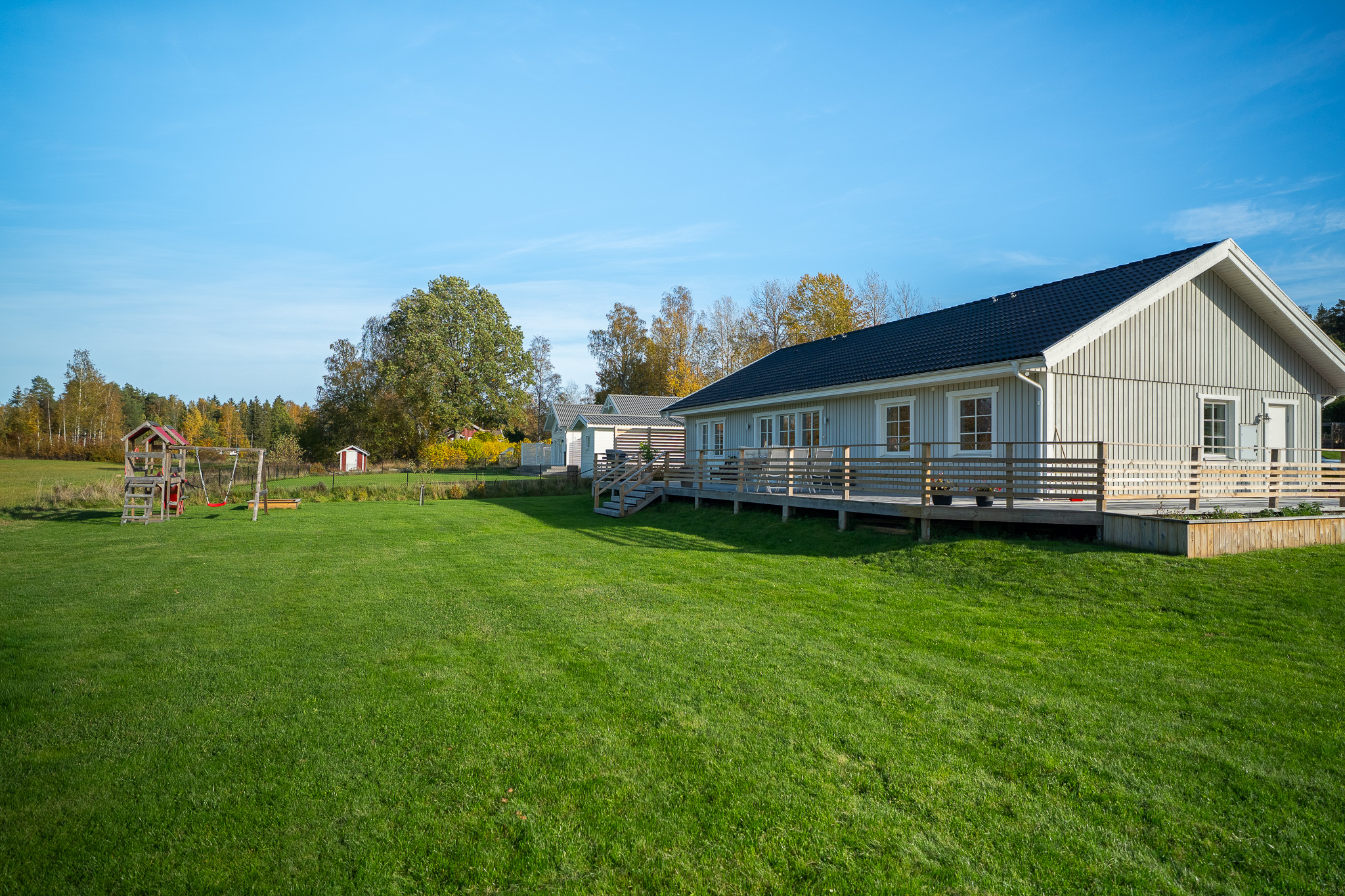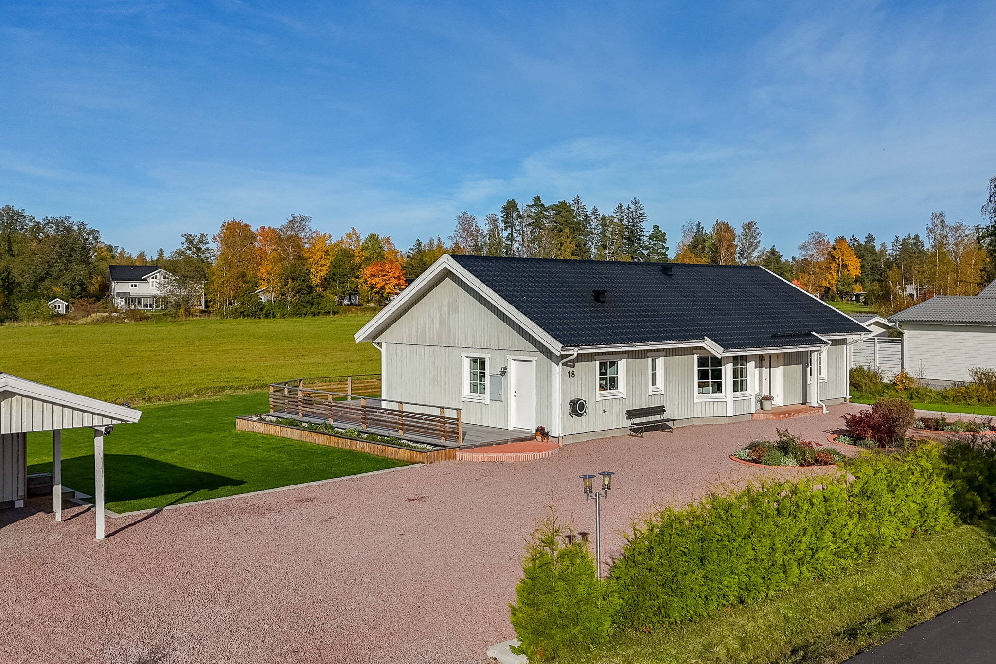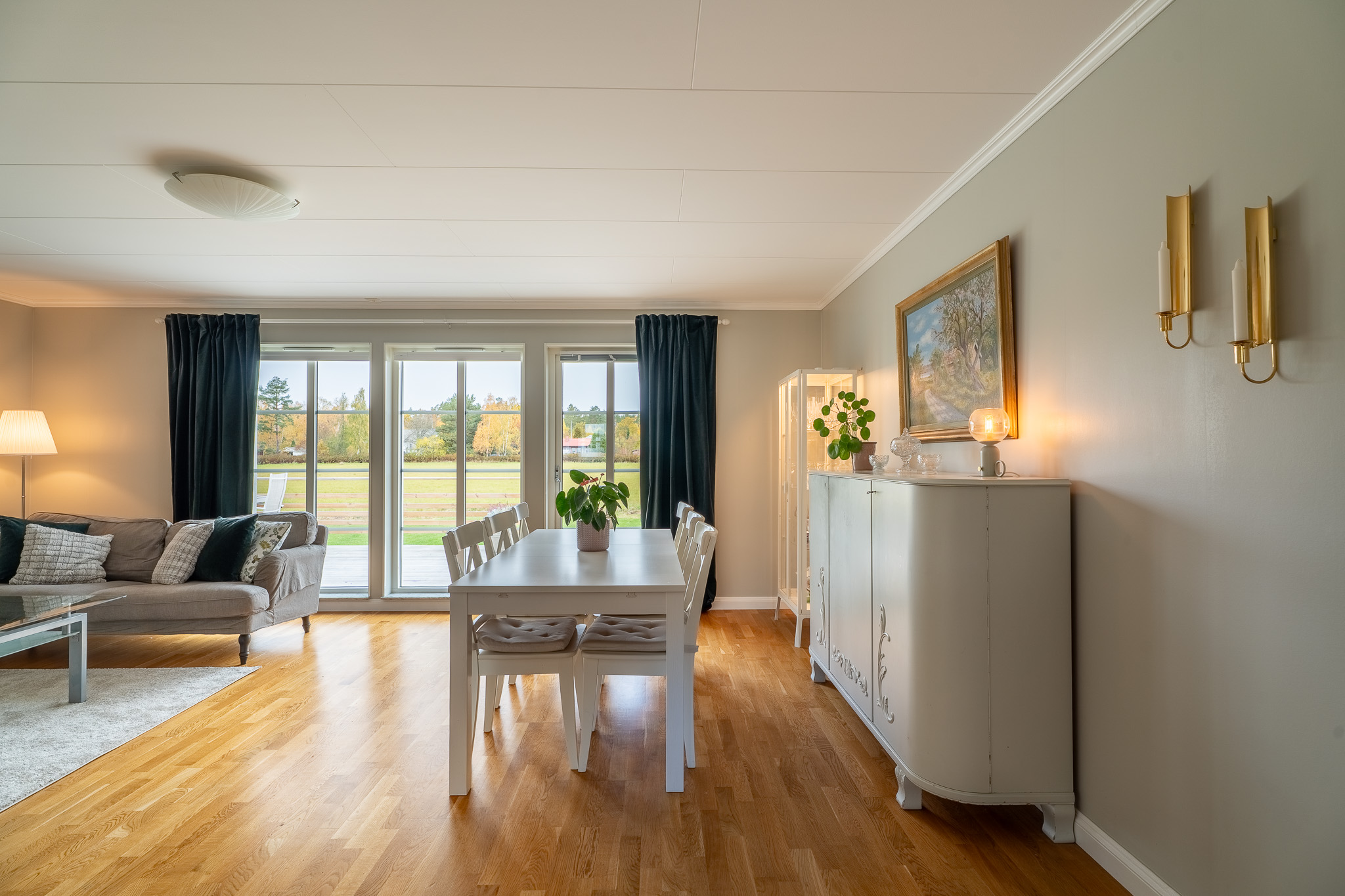 Välkommen till ett modernt enplanshus i natursköna Solvik. Här bor du bekvämt i ett välplanerat enplanshus om 130 kvm med sex rum och kök varav fyra sovrum. Bostadens ljusa sobra färger skapar tillsammans med det enhetliga golvet ett elegant och inbjudande helhetsintryck. Planlösningen är halvöppen mellan hall, kök och vardagsrum, vilket skapar utrymme för både familjeliv och umgänge. Köket och vardagsrum ligger centralt placerade mellan husets två sovrumsdelar, vilket ger en bra balans mellan umgänge och avskildhet. På den ena sidan finner ni två sovrum och ett trivsamt allrum som med fördel kan nyttjas som ungdomsrum eller varför inte för barnens lek, spel eller filmkvällar. På den andra sidan av huset ligger ytterligare två sovrum, varav det ena är lite större och kan nyttjas som ett master bedroom. Denna planlösning ger familjen möjlighet till egna privata ytor samtidigt som köket och vardagsrummet bildar en social samlingsplats för hela familjen. Bostadens kök från HTH är stilrent och funktionellt med gott om arbetsyta, generös förvaring och en inbjudande köksö som underlättar matlagningen och erbjuder extra serveringsyta. Köket är välutrustat med inbyggnadsugn, mikro, induktionshäll, fläkt, hel kyl och hel frys. Intill köket finner ni vardagsrummet som med sina stora fönsterpartier släpper in rikligt med ljus och ger er en vacker utsikt mot den natursköna omgivningen. Här finns gott om plats för både soffgrupp och matsalsmöbel, vilket gör rummet perfekt för både vardag och festligare tillställningar. Från vardagsrummet nås även den generösa altanen med fri vy över öppna fält. I huset finner ni även två badrum, båda smakfullt inredda. Det ena med dusch och det andra med bubbelbadkar. Med smart planerad planlösning finner ni även tvättstuga och groventré som ger er både nytta och funktion. Här finner ni både arbetsyta, förvaring, tvättmaskin, torktumlare och överskåp. Utvändigt möts du av en välskött tomt med nyanlagda perennrabatter på framsidan. Här finner ni även en carport med vidbyggt förråd och gott om plats för förvaring. Området är lugnt och barnvänligt, beläget på återvändsgata med närhet till natur, promenadstråk och badplats endast en kilometer bort. Här bor du lantligt men ändå nära staden. På Igelkottsvägen 18 bor du med cirka 7 minuters bilresa in till Torshälla och 15 minuter till Eskilstuna centrum. Varmt välkommen med din intresseanmälan!