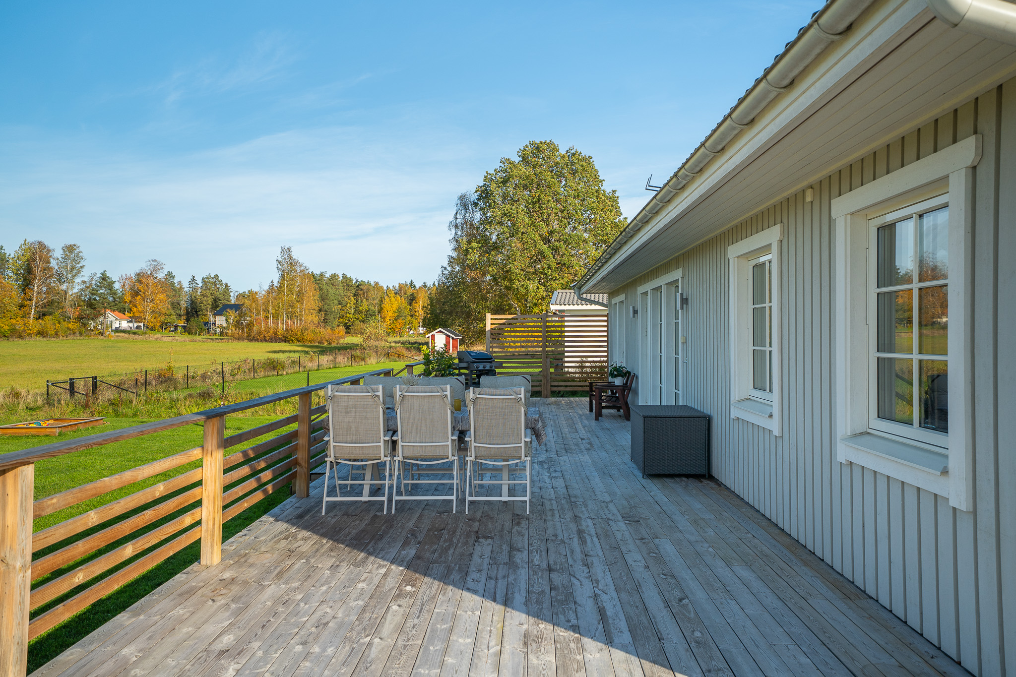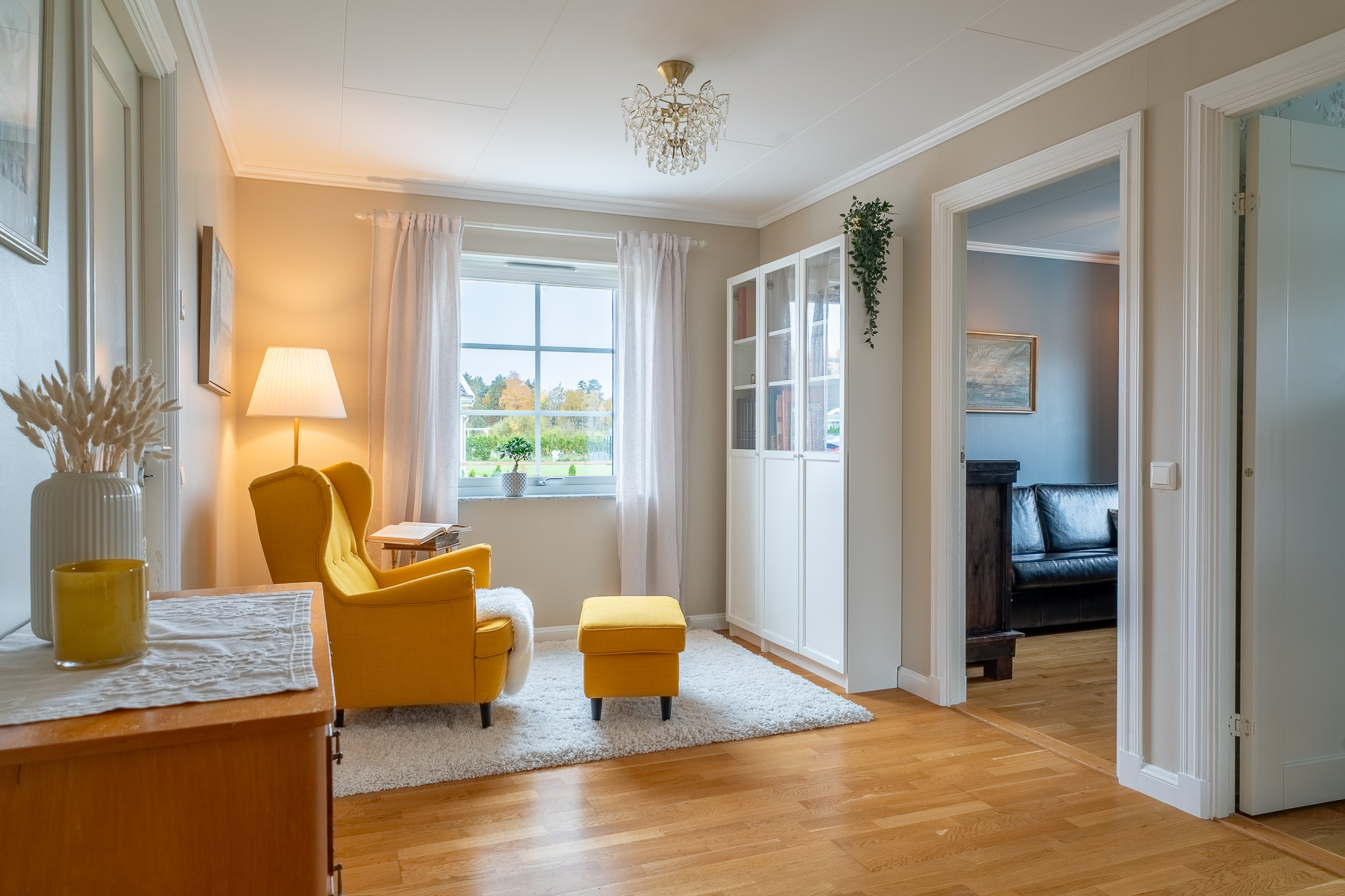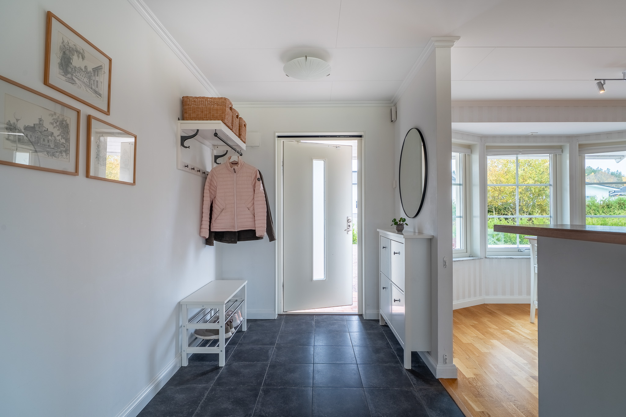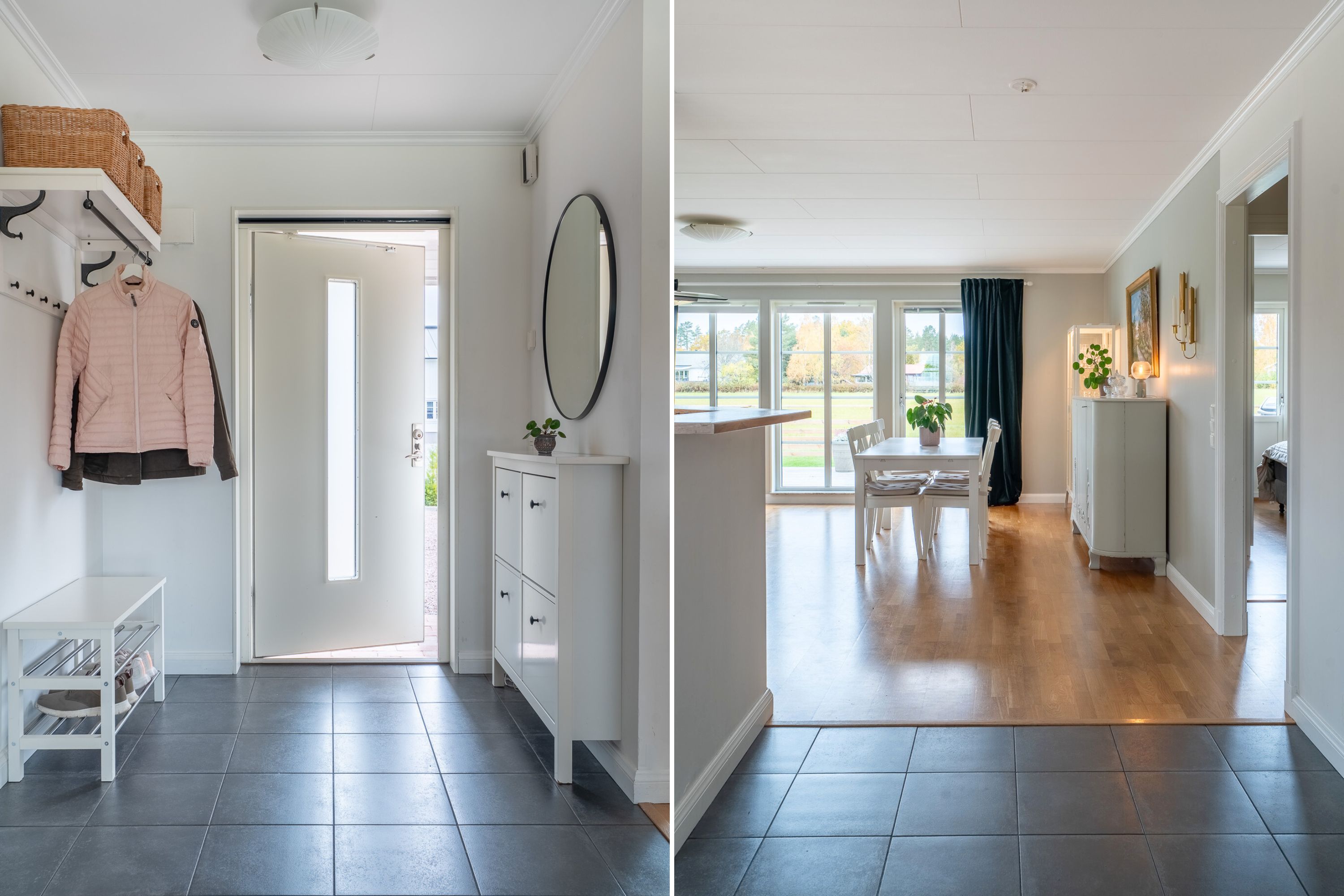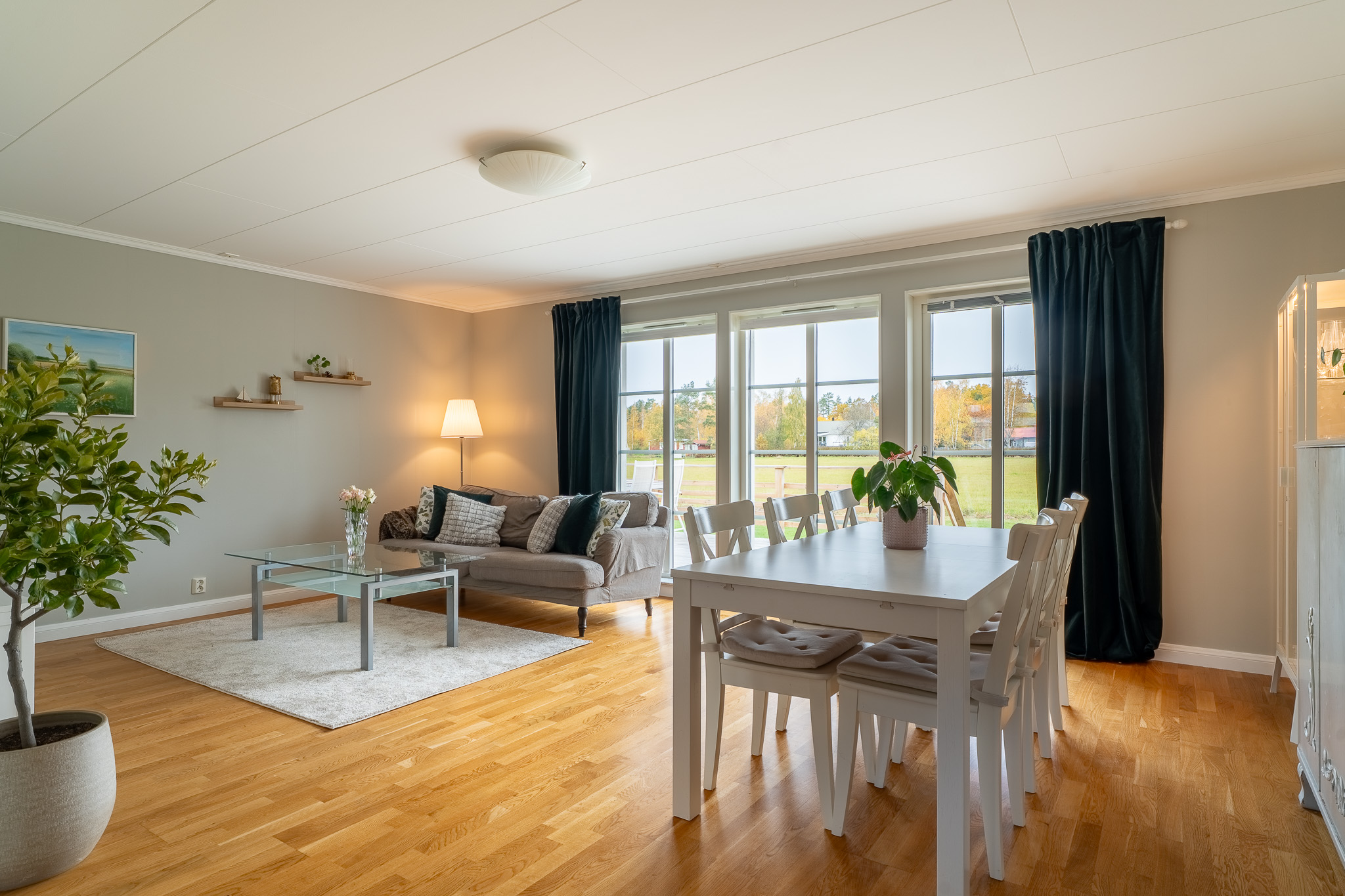 Välkommen till ett modernt enplanshus i natursköna Solvik. Här bor du bekvämt i ett välplanerat enplanshus om 130 kvm med sex rum och kök varav fyra sovrum. Bostadens ljusa sobra färger skapar tillsammans med det enhetliga golvet ett elegant och inbjudande helhetsintryck. Planlösningen är halvöppen mellan hall, kök och vardagsrum, vilket skapar utrymme för både familjeliv och umgänge. Köket och vardagsrum ligger centralt placerade mellan husets två sovrumsdelar, vilket ger en bra balans mellan umgänge och avskildhet. På den ena sidan finner ni två sovrum och ett trivsamt allrum som med fördel kan nyttjas som ungdomsrum eller varför inte för barnens lek, spel eller filmkvällar. På den andra sidan av huset ligger ytterligare två sovrum, varav det ena är lite större och kan nyttjas som ett master bedroom. Denna planlösning ger familjen möjlighet till egna privata ytor samtidigt som köket och vardagsrummet bildar en social samlingsplats för hela familjen. Bostadens kök från HTH är stilrent och funktionellt med gott om arbetsyta, generös förvaring och en inbjudande köksö som underlättar matlagningen och erbjuder extra serveringsyta. Köket är välutrustat med inbyggnadsugn, mikro, induktionshäll, fläkt, hel kyl och hel frys. Intill köket finner ni vardagsrummet som med sina stora fönsterpartier släpper in rikligt med ljus och ger er en vacker utsikt mot den natursköna omgivningen. Här finns gott om plats för både soffgrupp och matsalsmöbel, vilket gör rummet perfekt för både vardag och festligare tillställningar. Från vardagsrummet nås även den generösa altanen med fri vy över öppna fält. I huset finner ni även två badrum, båda smakfullt inredda. Det ena med dusch och det andra med bubbelbadkar. Med smart planerad planlösning finner ni även tvättstuga och groventré som ger er både nytta och funktion. Här finner ni både arbetsyta, förvaring, tvättmaskin, torktumlare och överskåp. Utvändigt möts du av en välskött tomt med nyanlagda perennrabatter på framsidan. Här finner ni även en carport med vidbyggt förråd och gott om plats för förvaring. Området är lugnt och barnvänligt, beläget på återvändsgata med närhet till natur, promenadstråk och badplats endast en kilometer bort. Här bor du lantligt men ändå nära staden. På Igelkottsvägen 18 bor du med cirka 7 minuters bilresa in till Torshälla och 15 minuter till Eskilstuna centrum. Varmt välkommen med din intresseanmälan!