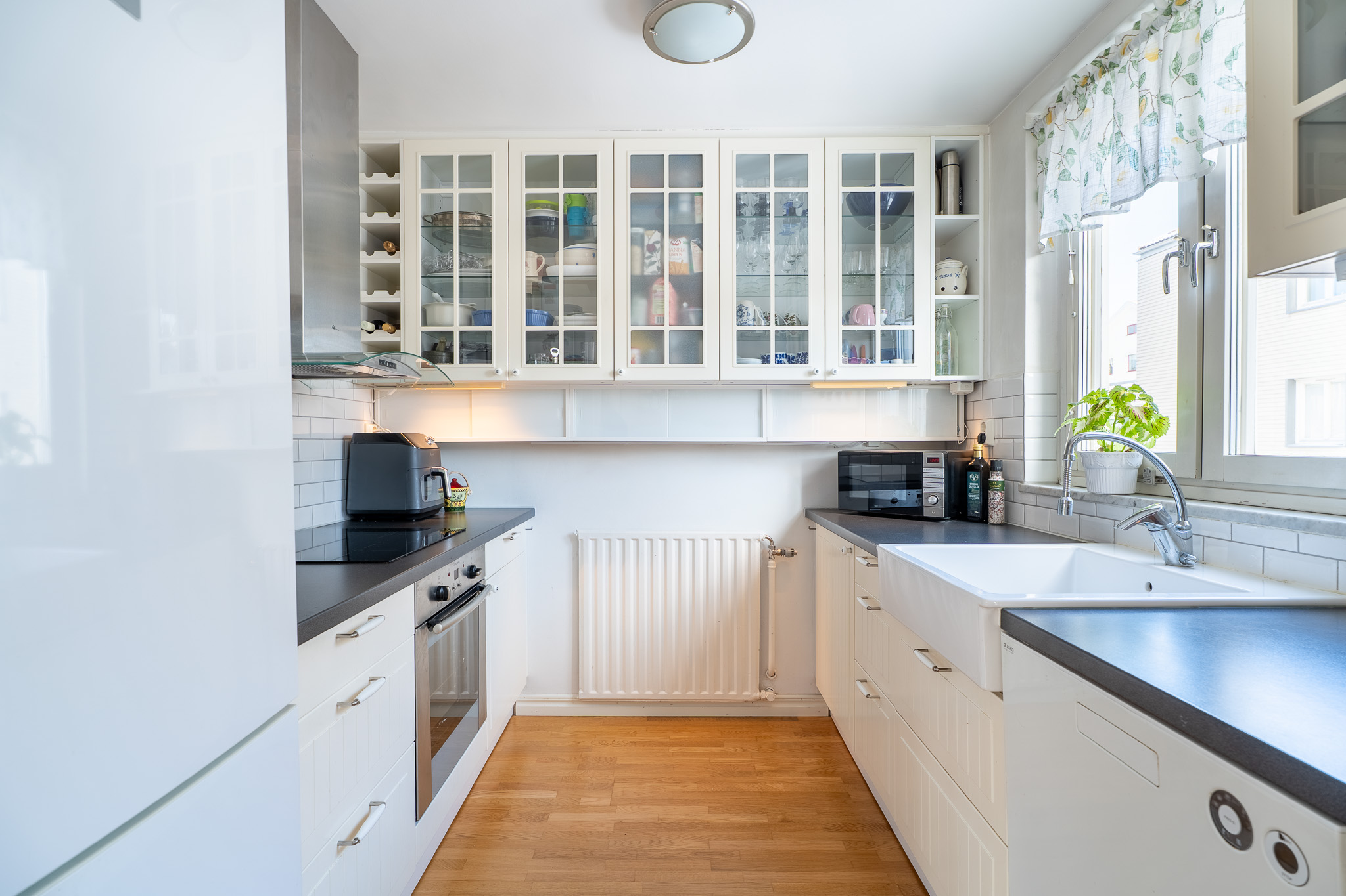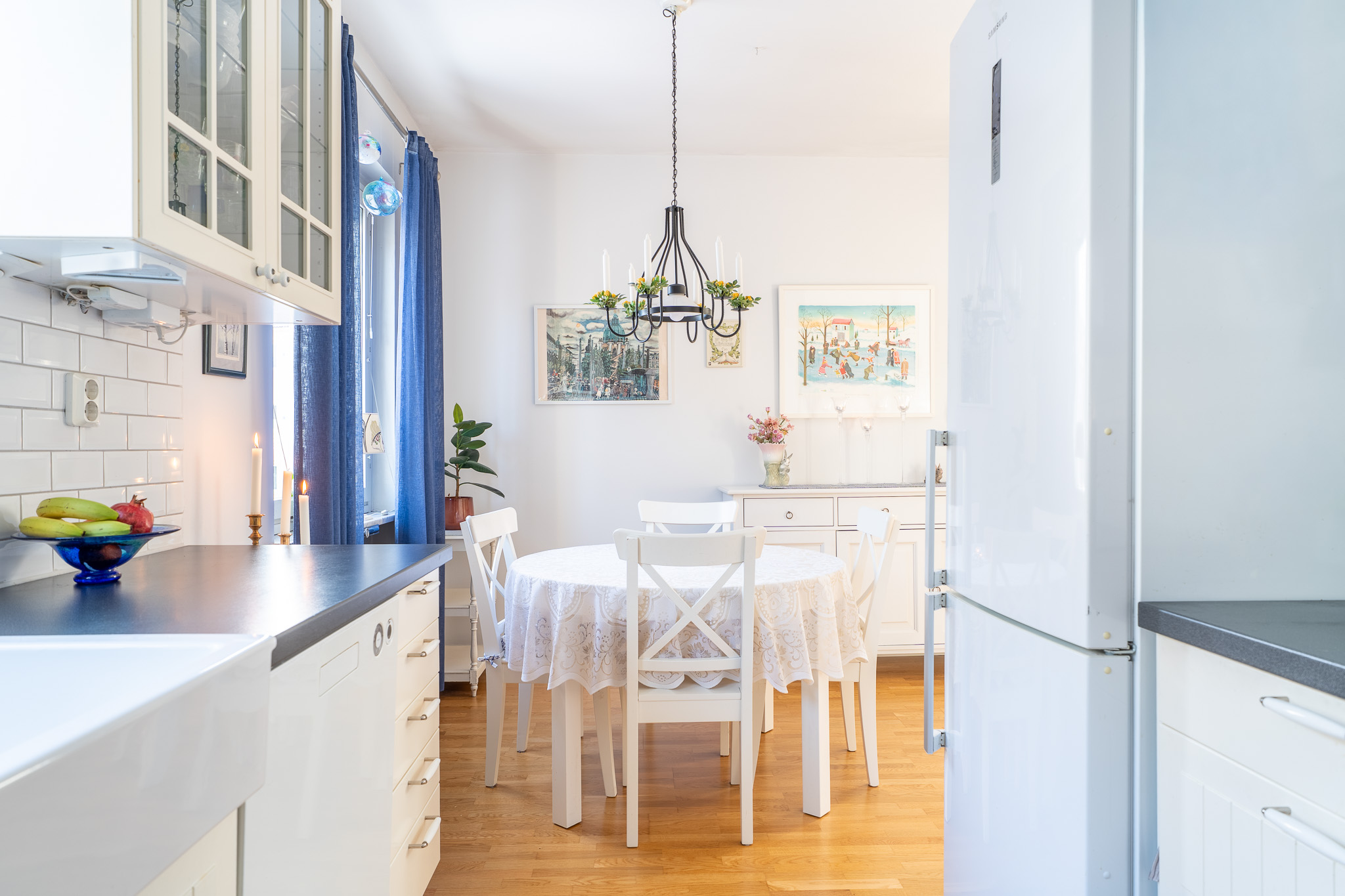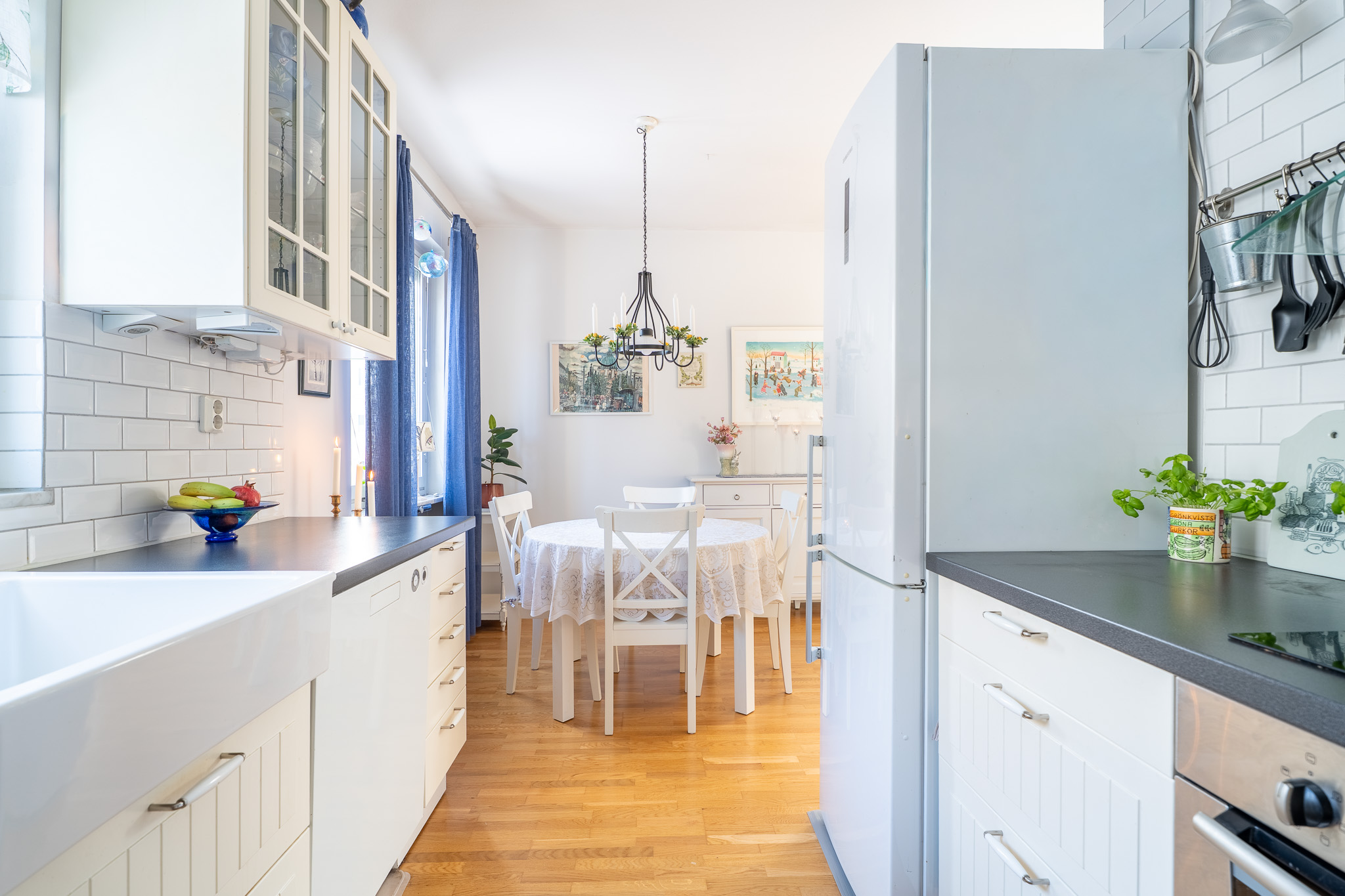 Lantligt kök med vackra vitrinskåp samt extra stor diskho med utsikt över innergården. Här erbjuds skåp och lådor i vitt utförande i kombination med vitt kakel. Här erbjuds bra förvaringsmöjligheter, vinställ, induktionshäll, ugn, diskmaskin, fläkt samt kombinerad kyl och frys. Intill köket erbjuds en matplats för 4-6 personer.