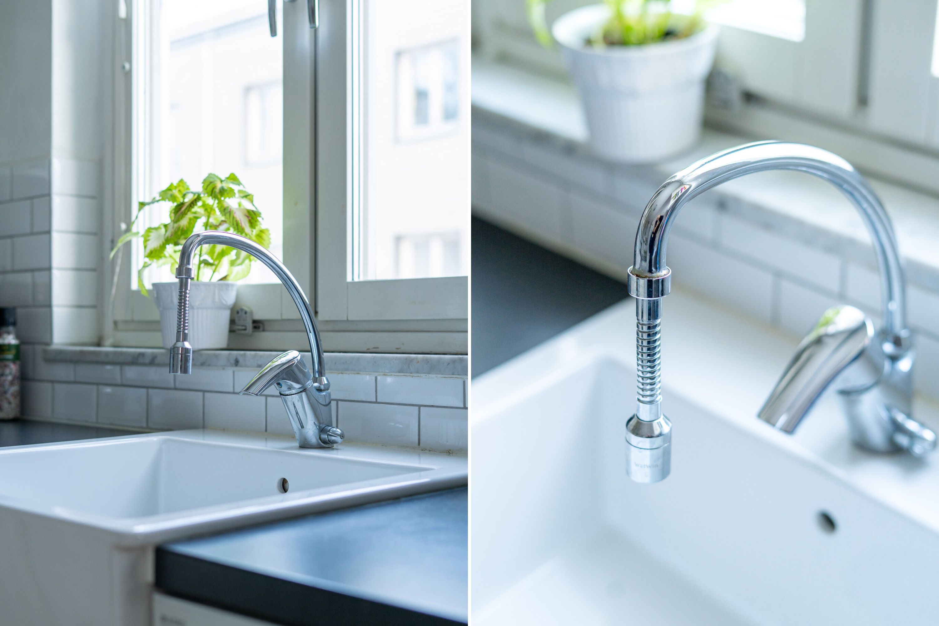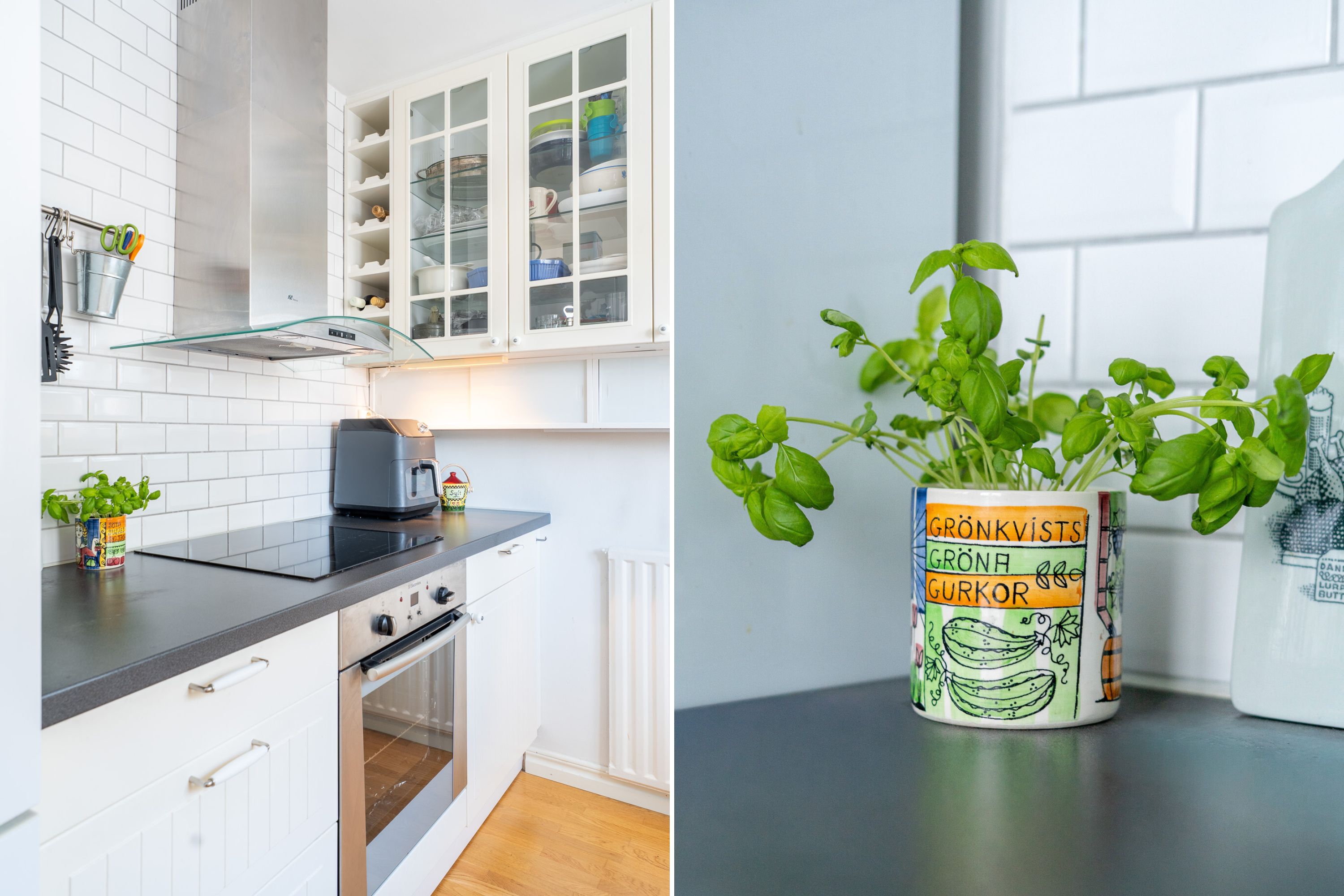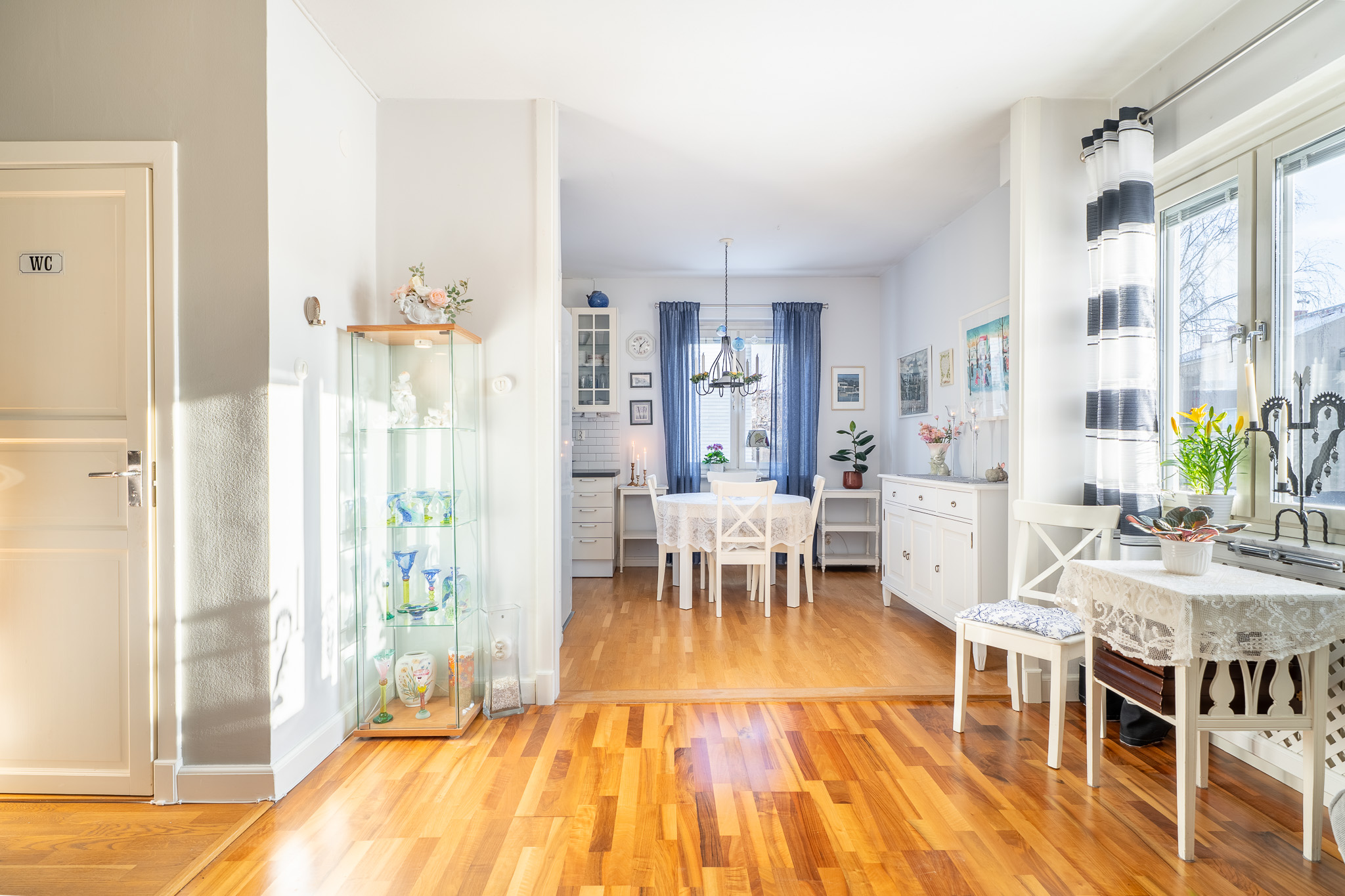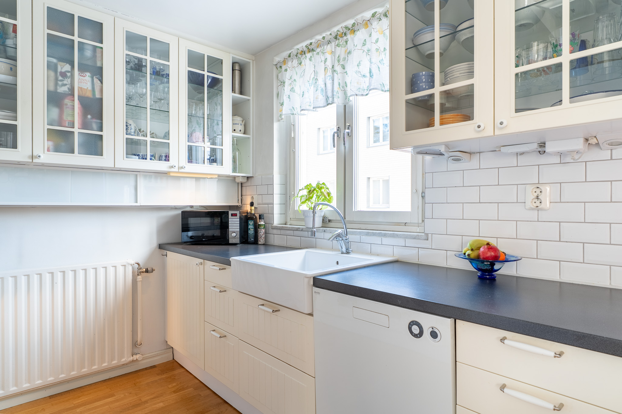 Lantligt kök med vackra vitrinskåp samt extra stor diskho med utsikt över innergården. Här erbjuds skåp och lådor i vitt utförande i kombination med vitt kakel. Här erbjuds bra förvaringsmöjligheter, vinställ, induktionshäll, ugn, diskmaskin, fläkt samt kombinerad kyl och frys. Intill köket erbjuds en matplats för 4-6 personer.