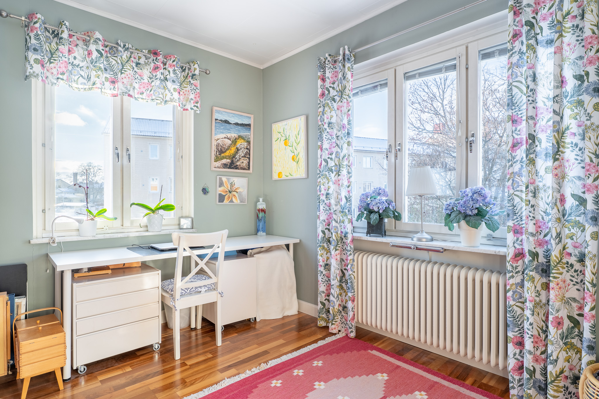 Bostadens tredje och sista sovrum nås från vardagsrummet. Detta rum har ett vackert ljusinsläpp via två fönster i två olika väderstreck. Trivsam färgsättning med väggar i en mjuk grön nyans och ett passande laminatgolv. Här finns det plats för en mindre säng samt skrivbordsmöbel.