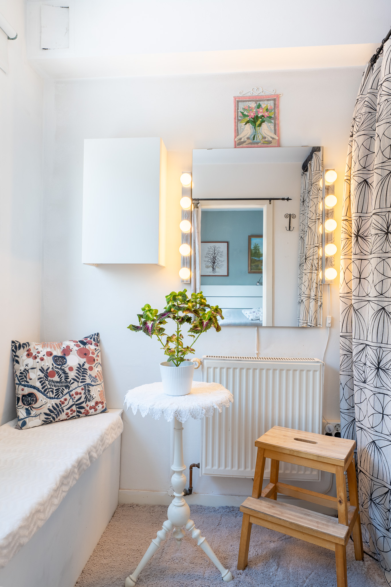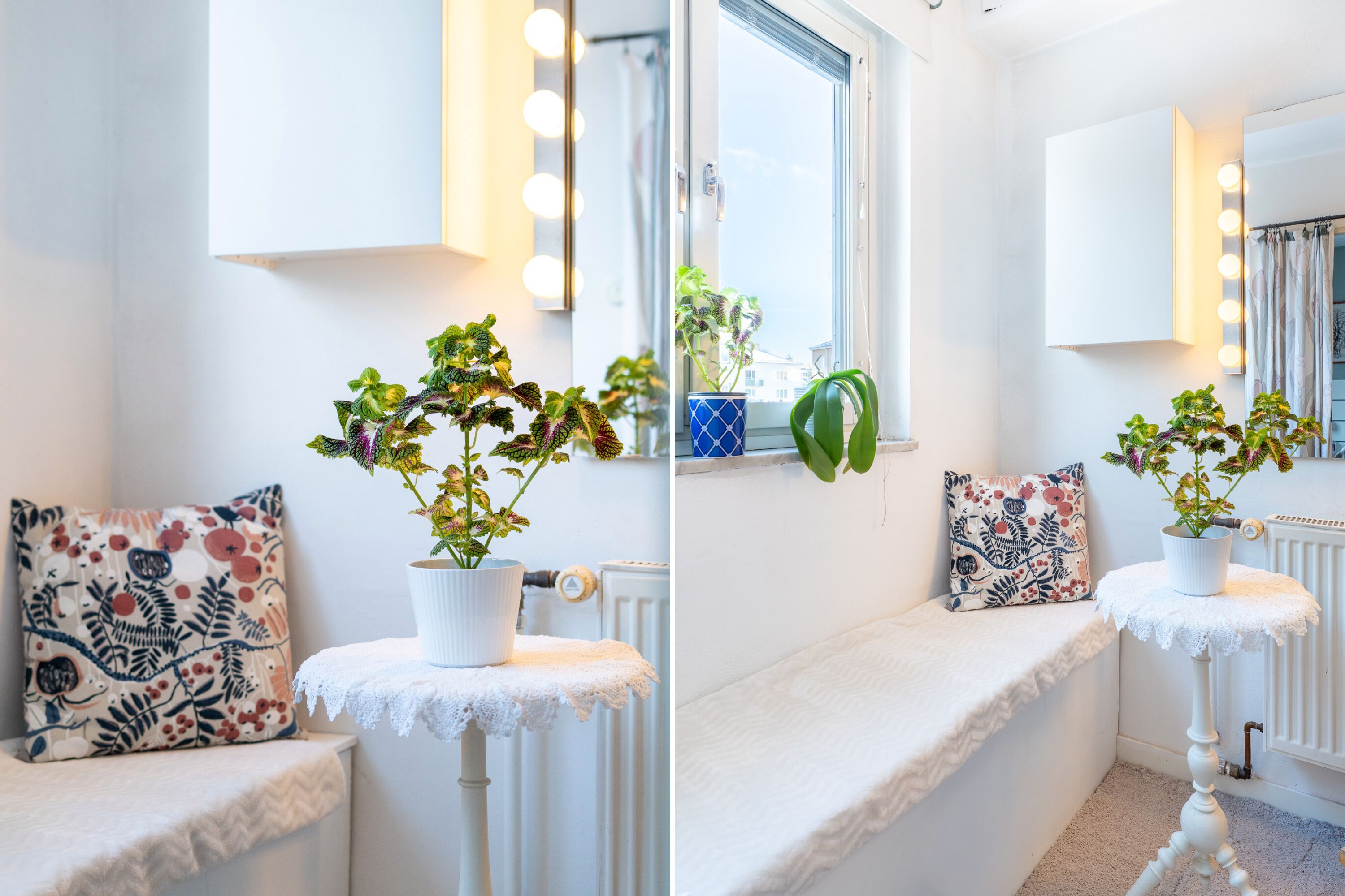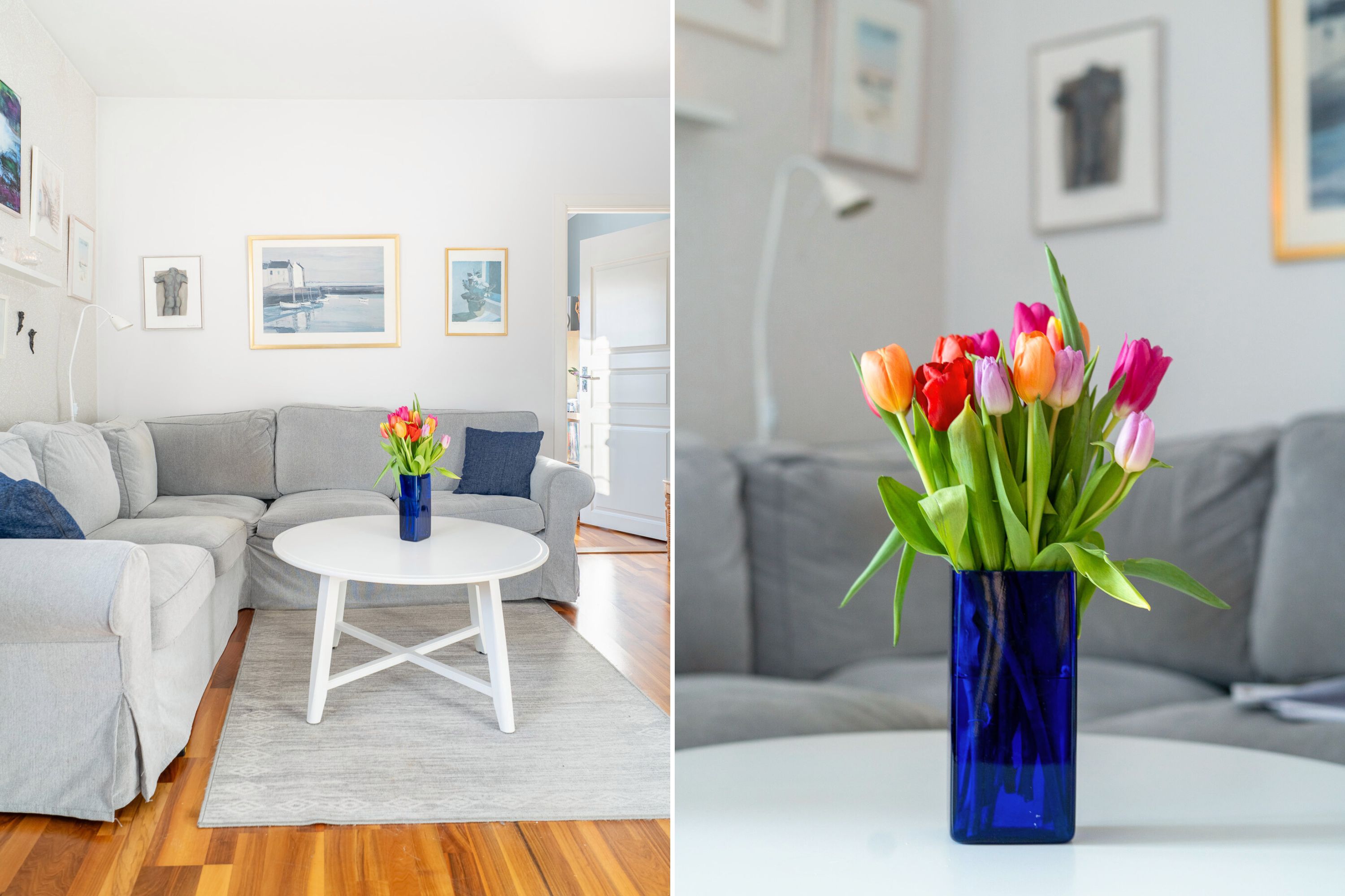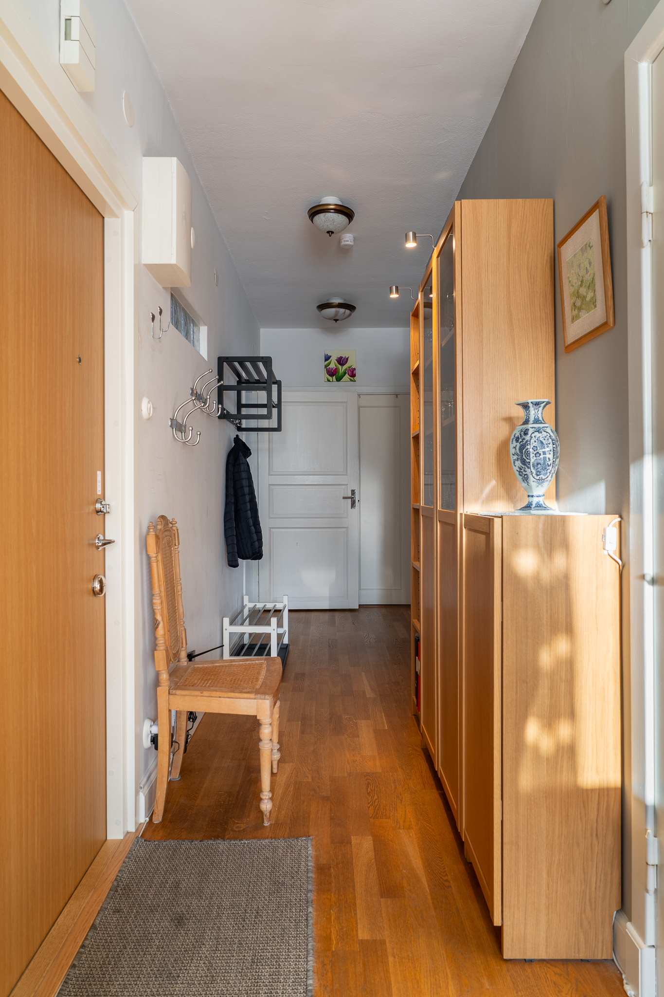 Välkommen in! Här erbjuds en rymlig hall med ljusa väggar i kombination med ett klassiskt parkettgolv. Till vänster om ytterdörren erbjuds plats för avhängning av ytterkläder. Vidare in i hallen finner man två rymliga klädkammare för extra förvaring. Från hallen når man även bostadens duschrum och wc.