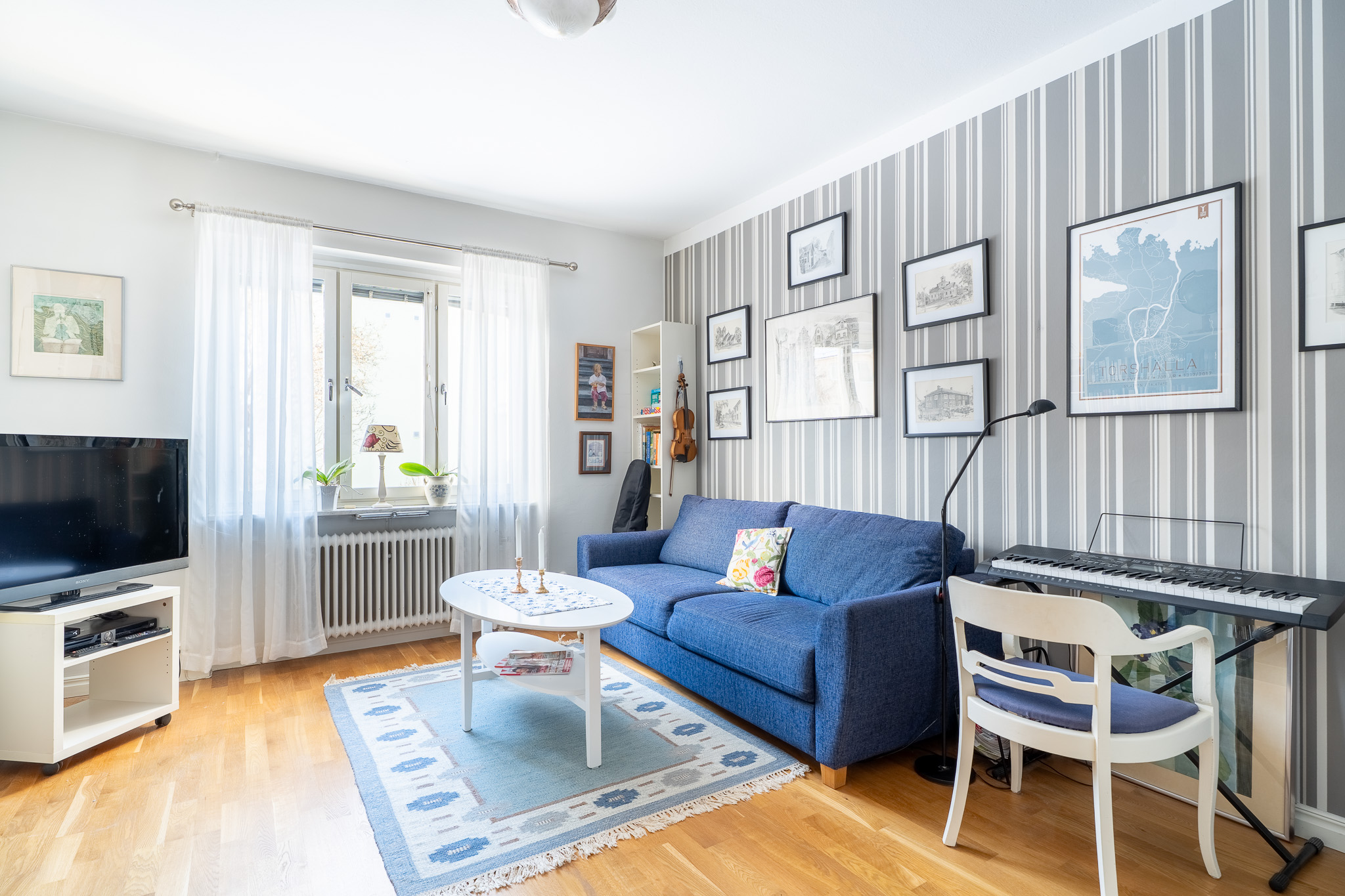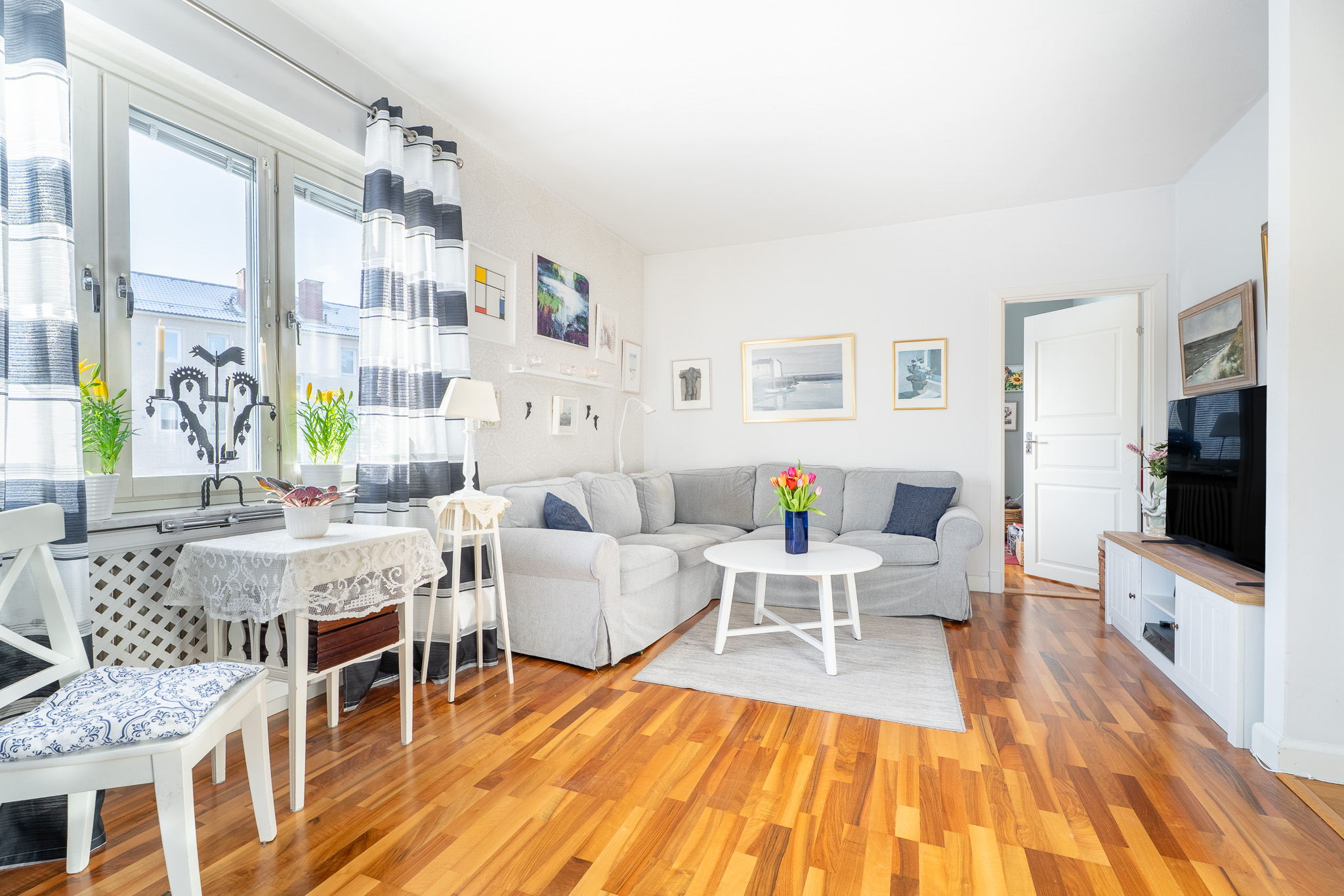 Trivsamt vardagsrum med trevligt ljusinsläpp via ett stort fönster. Här erbjuds plats för en soffgrupp med tillhörande tv-möbel. Från detta rum når man även bostadens tredje sovrum.