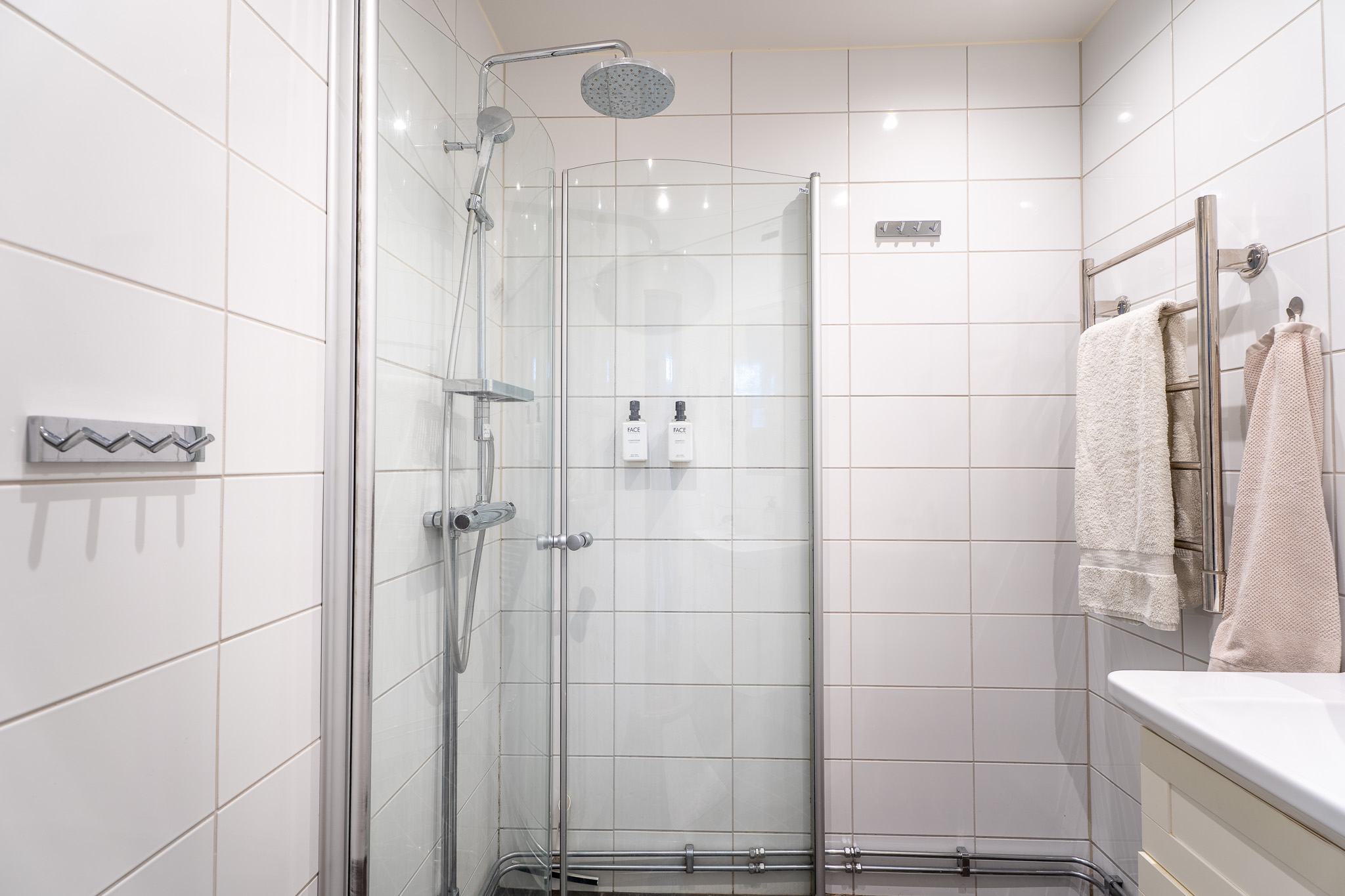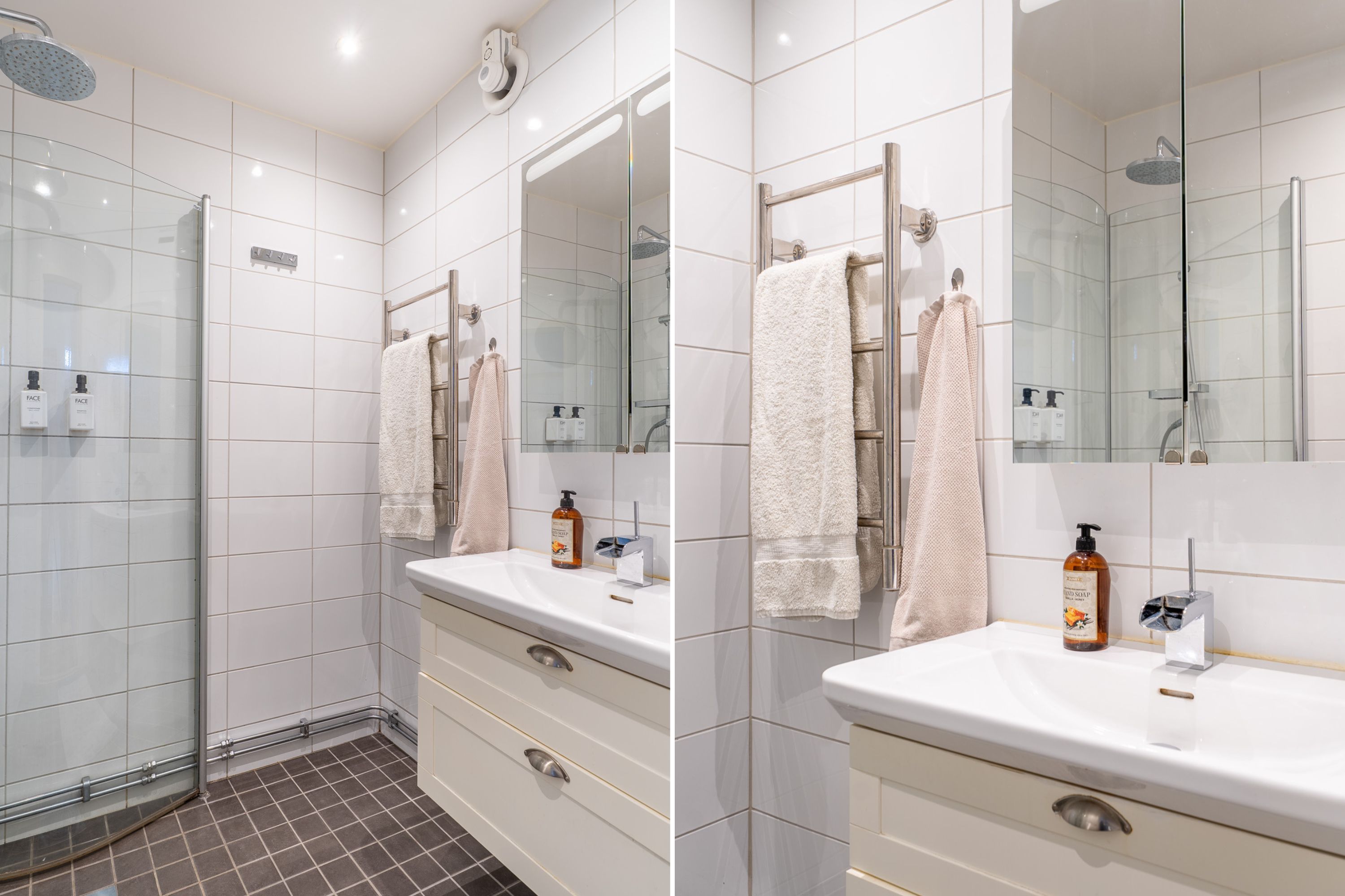Modernt helkaklat duschrum i sober färgsättning från 2015. Här erbjuds dusch med glasdörrar, tvättfat på kommod, spegel med belysning och handdukstork.