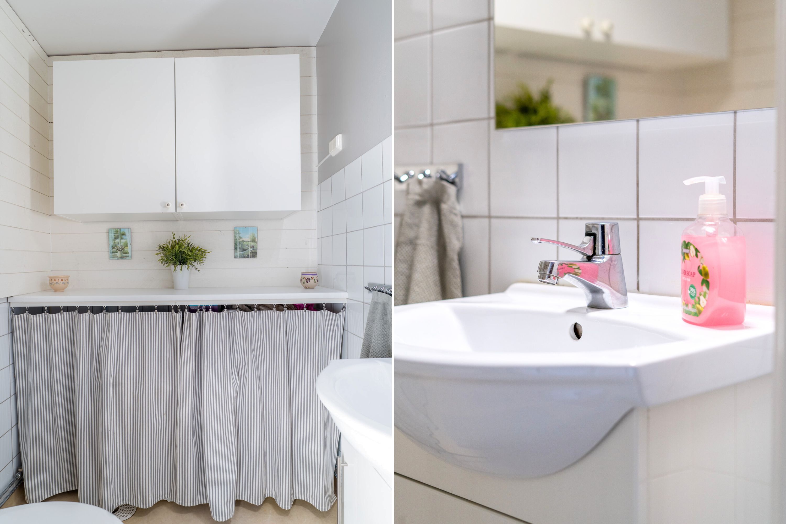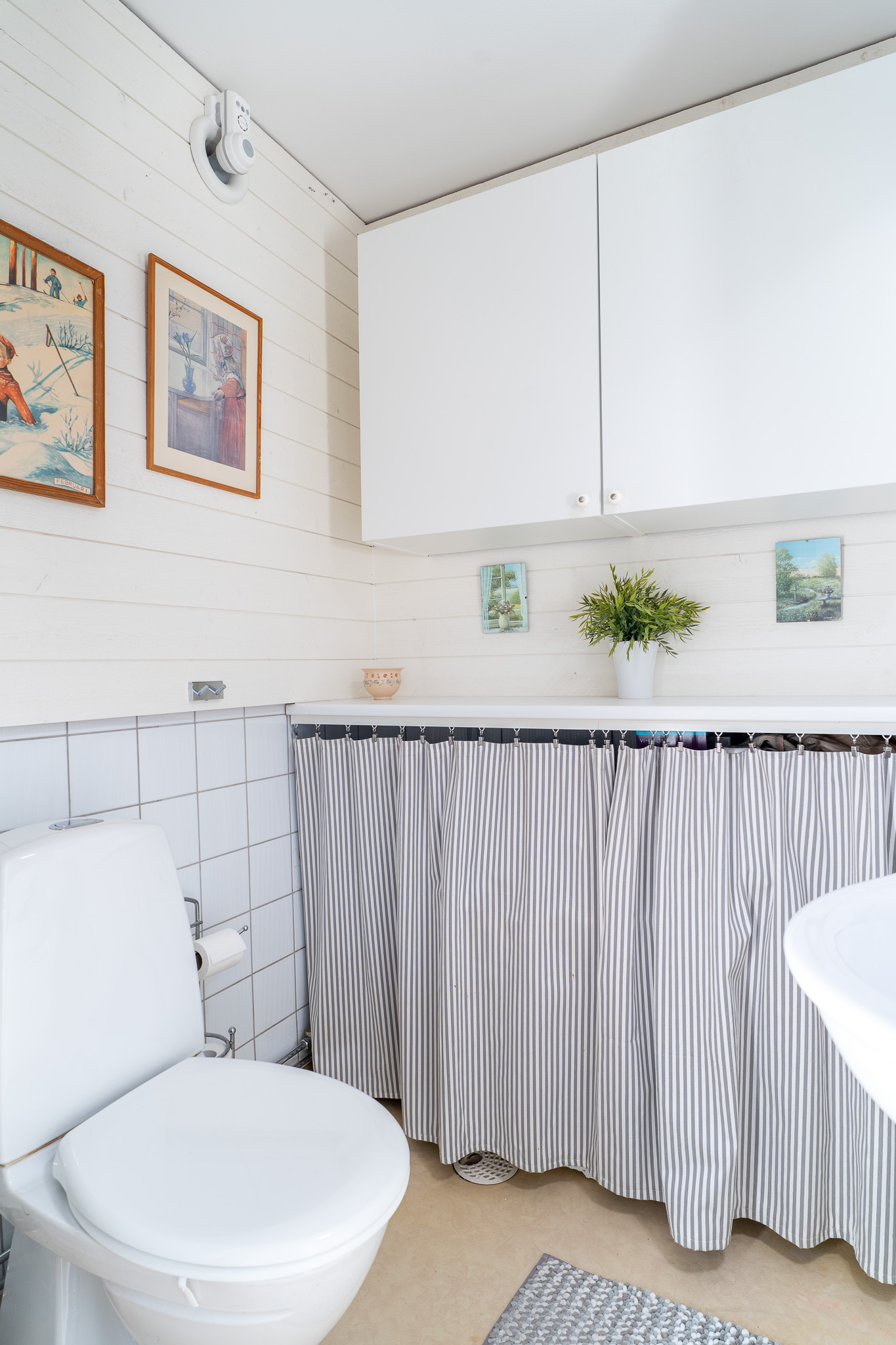 Intill duschrummet erbjuds en wc. Här finner man tvättfat på kommod, spegel på vägg samt wc. Önskar man ha en tvättmaskin så finns det förberett för det.