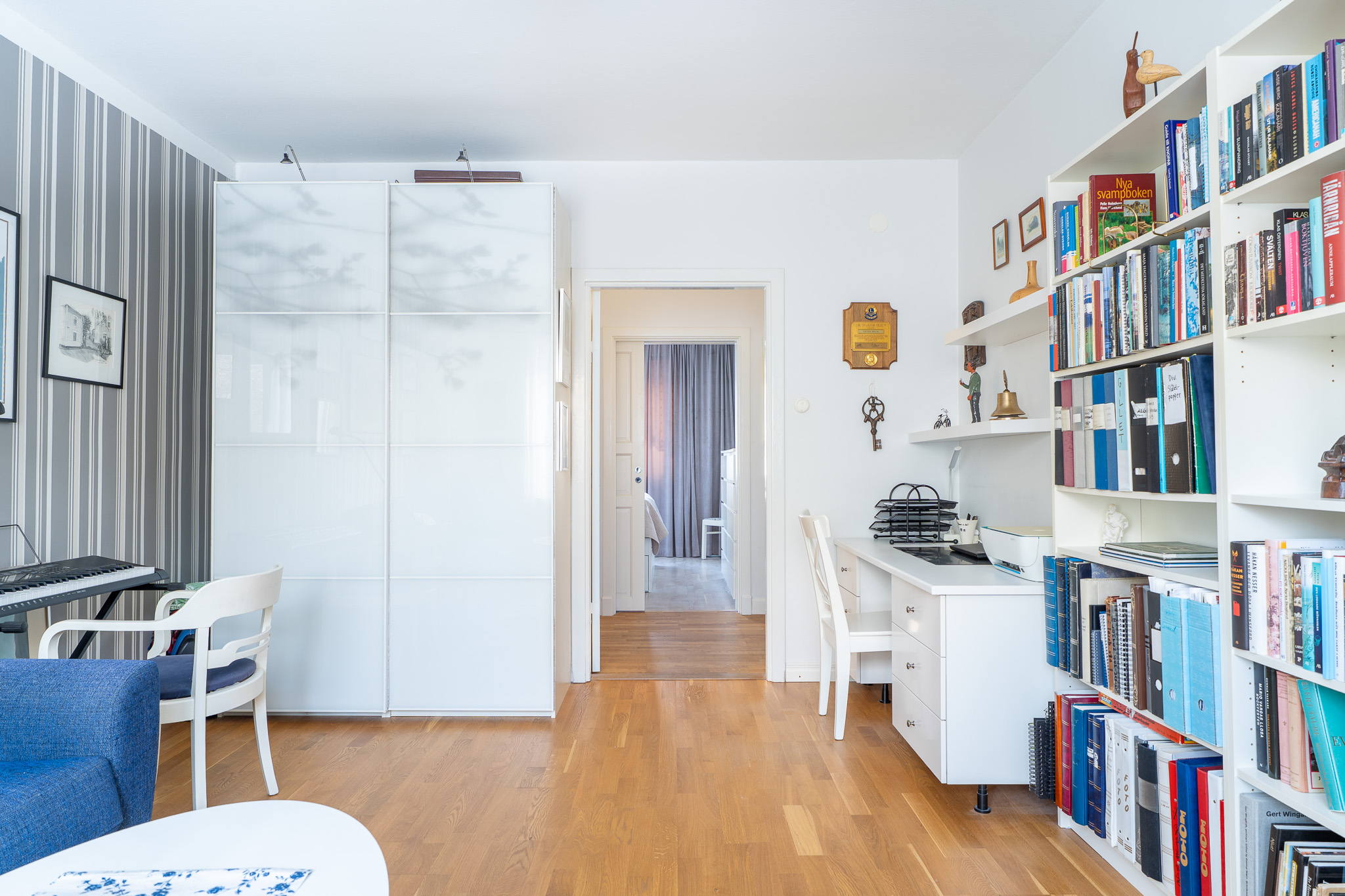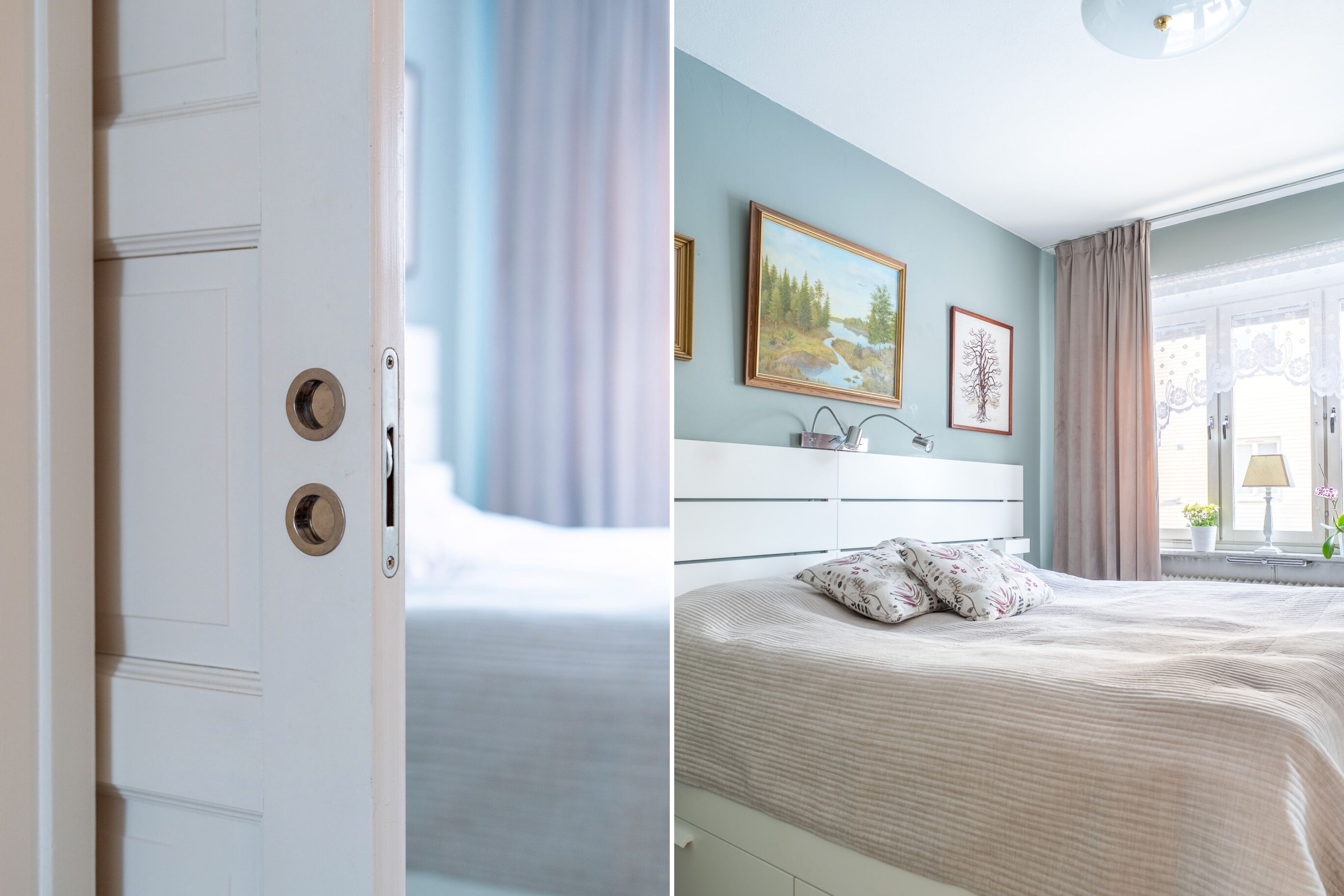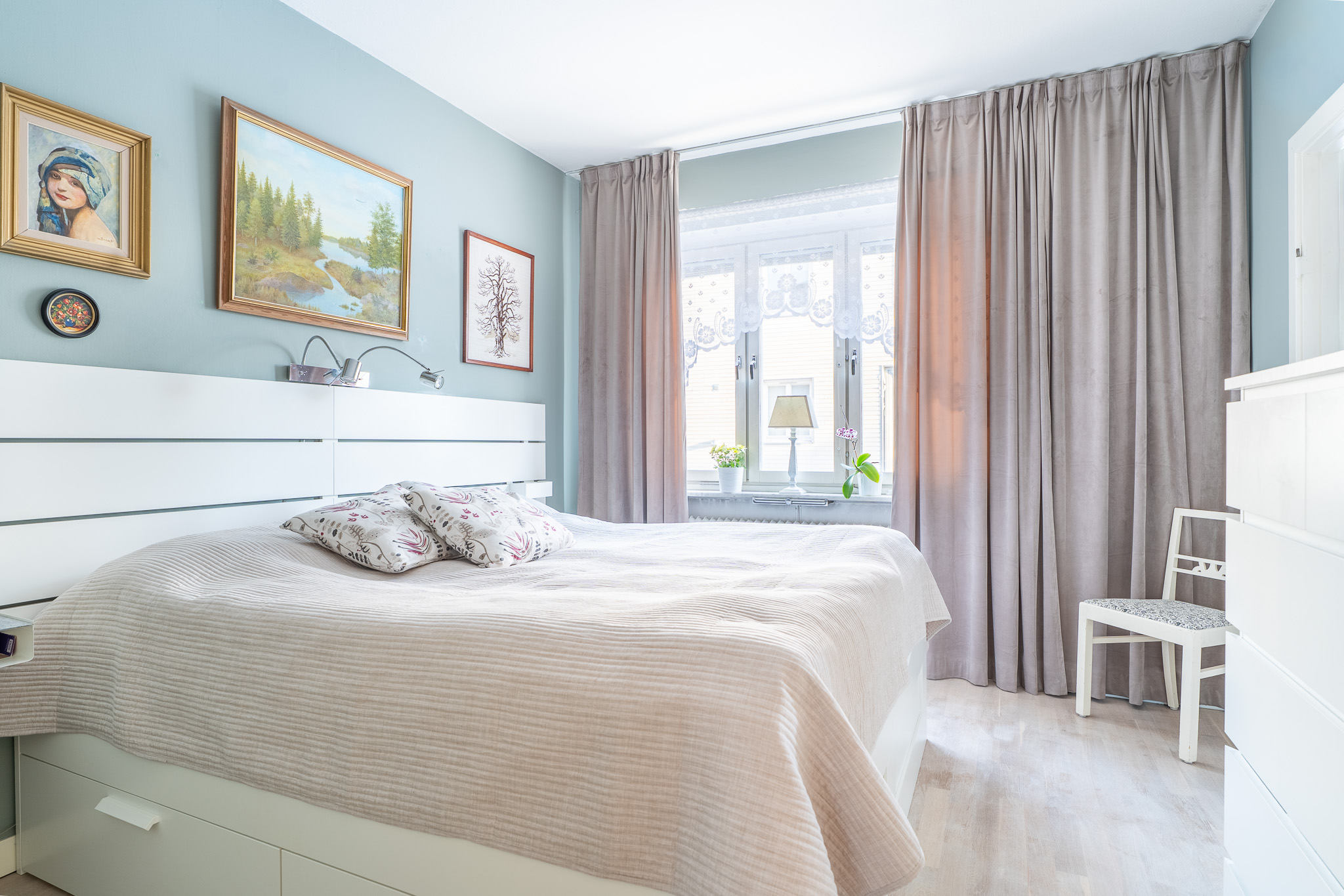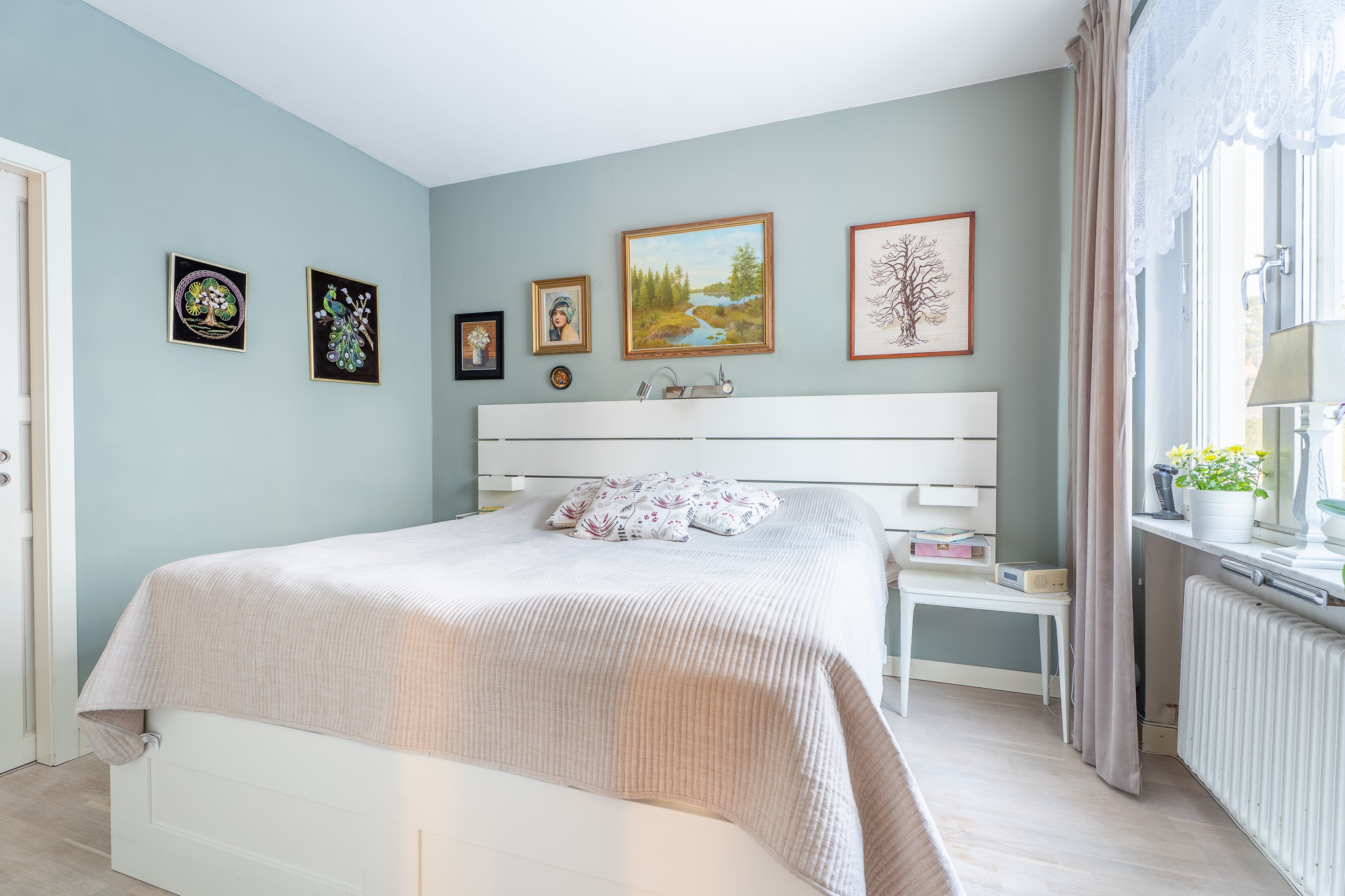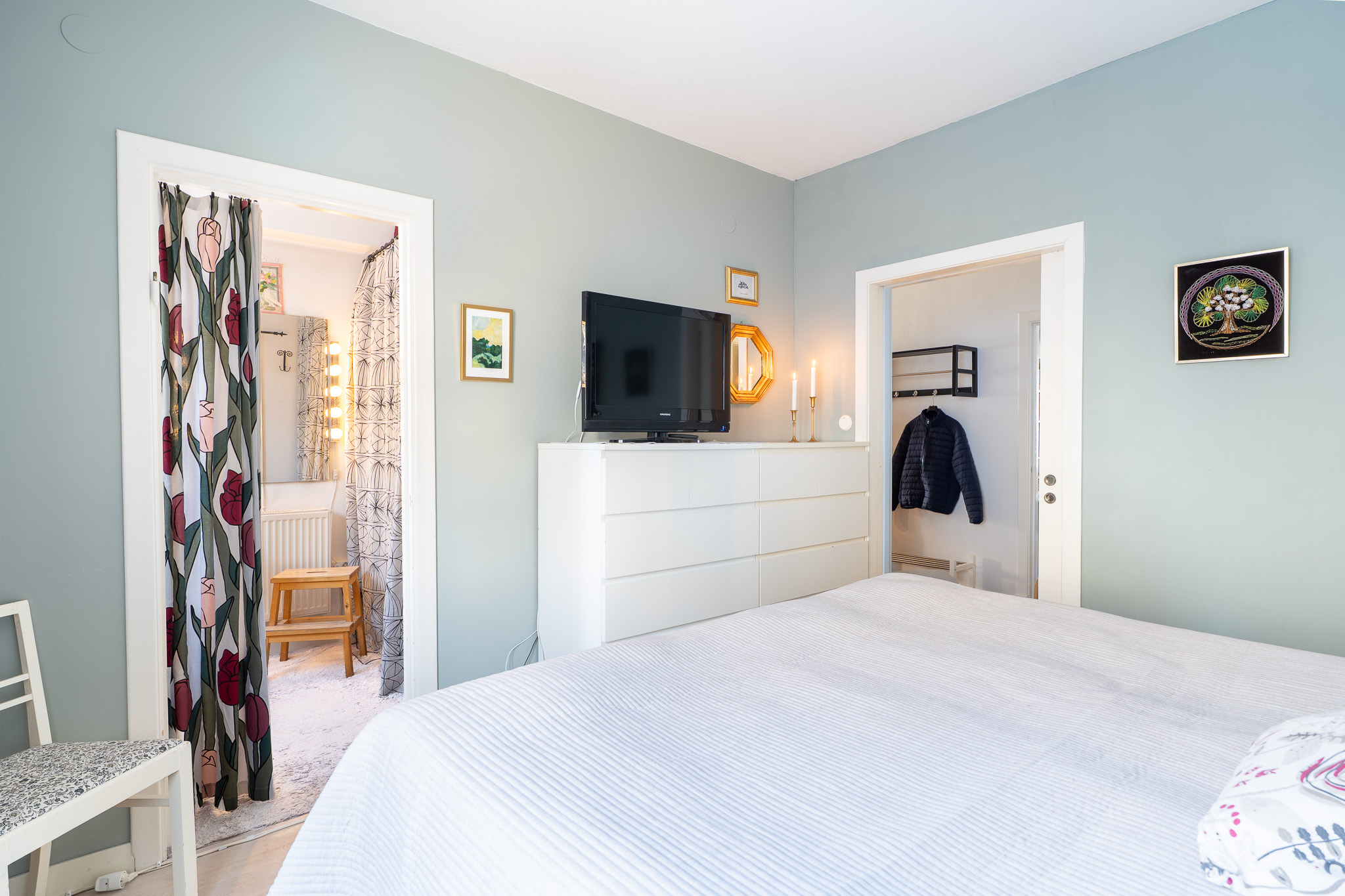 Bostadens största sovrum är föräldrasovrummet som rymmer gott om plats för en stor dubbelsäng med tillhörande sängbord. Här finns också en platsbyggd garderob för bra förvaring. Rummet har ett vackert ljusinsläpp via ett stort fönsterparti som ger de ljusa väggarna och parkettgolvet ett fint lyster!